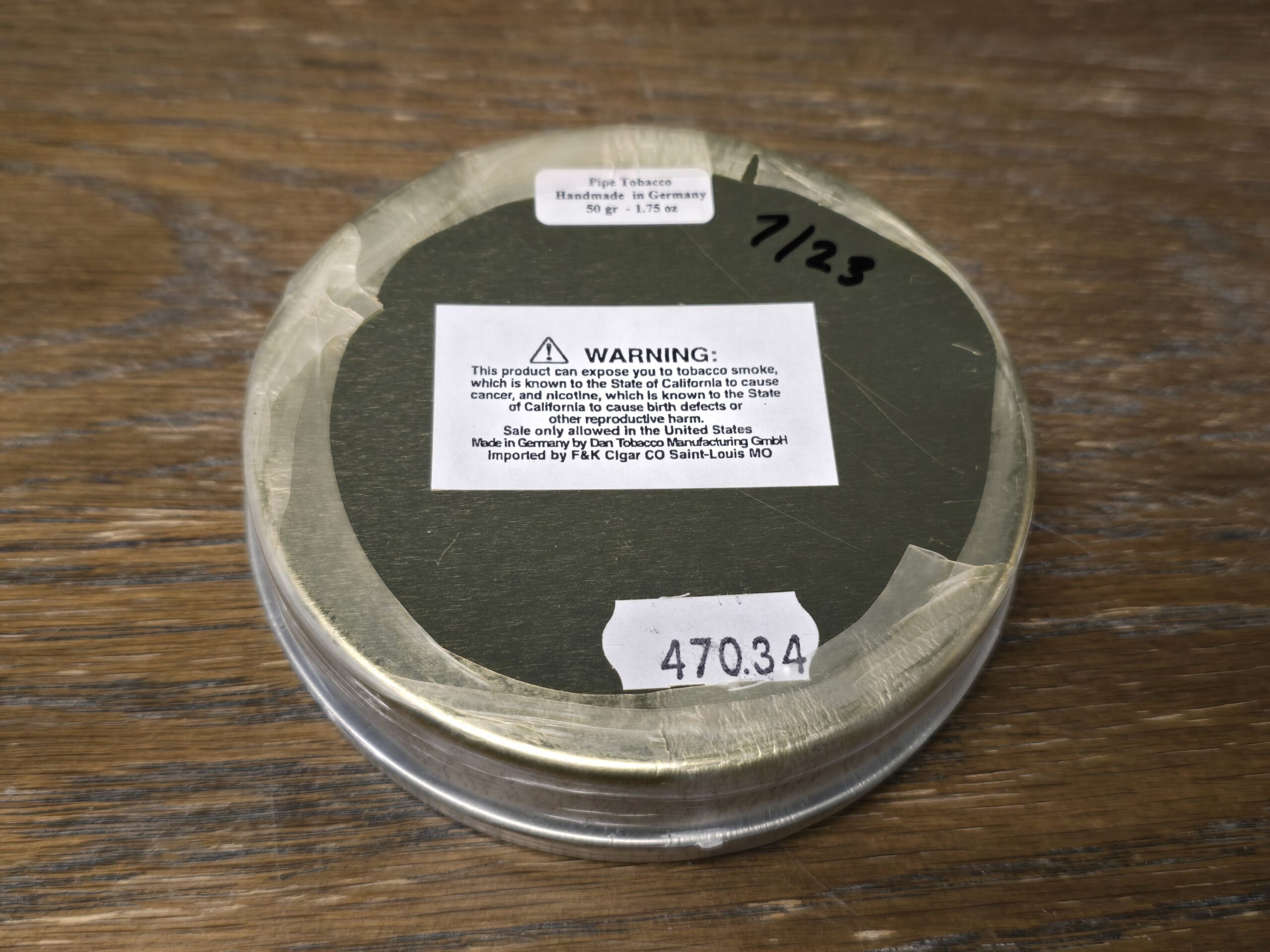 1 Tin - A mixture of choice, golden-brown Virginia varietals and each a small portion of Kentucky and dark fired Virginia. The addition of a flavored ready rubbed Virginia flake give its a pleasing aroma. The smooth spice comes from a little whiff of latakia, whose smokiness is always tamed in the back. The cut is rather short, so it offers a slow burn and cool smoke with aromatic-spicy flavors and a wonderful bouquet.