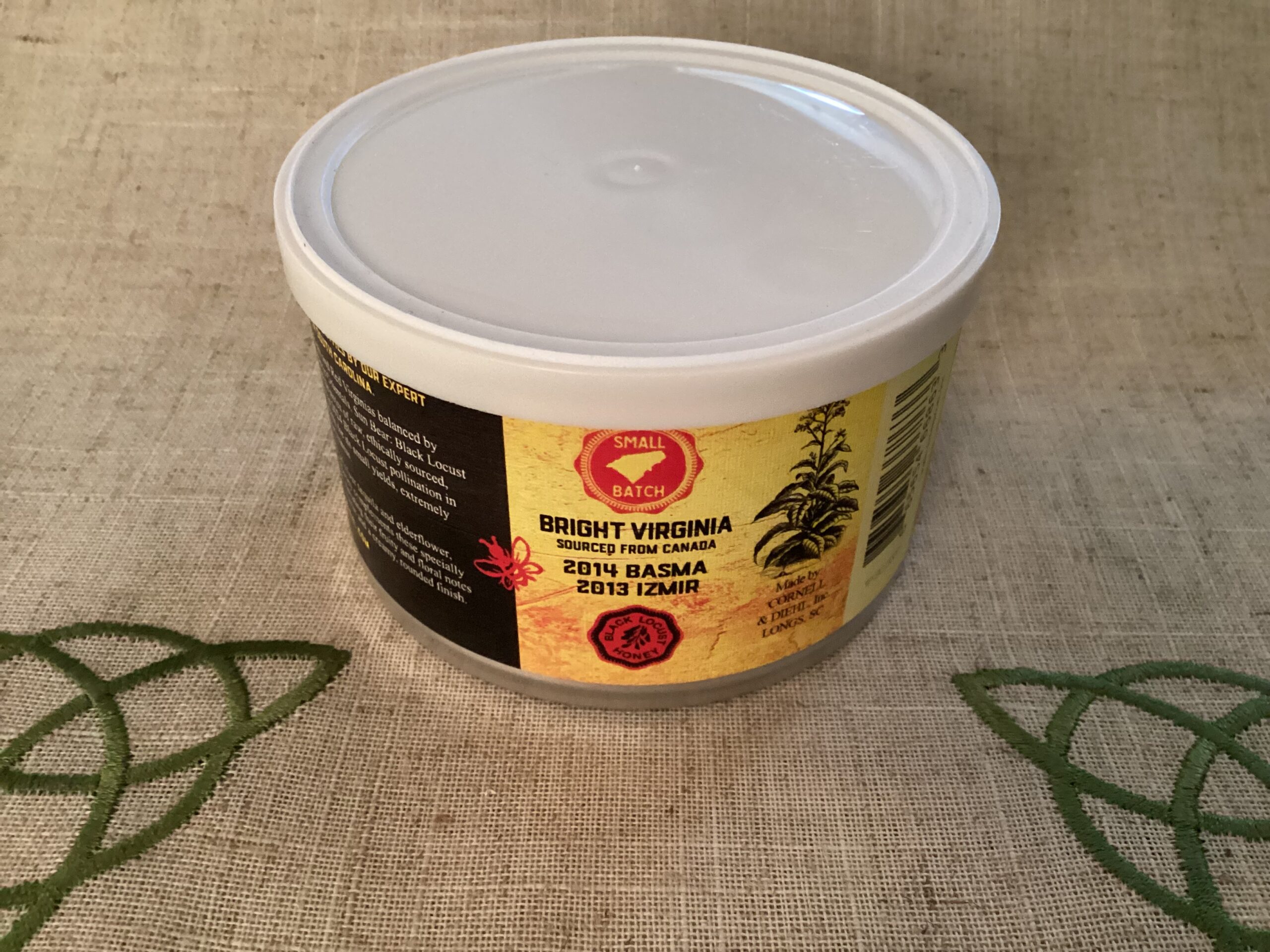 A blend of the finest Bright and Red Virginias balanced by 2014 Basma and 2013 Izmir Orientals, Cornell & Diehl's Sun Bear: Black Locust commends itself with subtle notes of raw, ethically sourced, single-farm honey from the Black Locust pollination in Maryland — a variety prized for its small yields, extremely light color, and delicate sweetness. Combined with a whisper of silver tequila and elderflower, the natural Black Locust honey complements these specially selected varietal tobaccos, elevating their fruity and floral notes for a bright, refreshing character and a creamy, rounded finish. Can is sealed, dated 071624, in excellent condition.