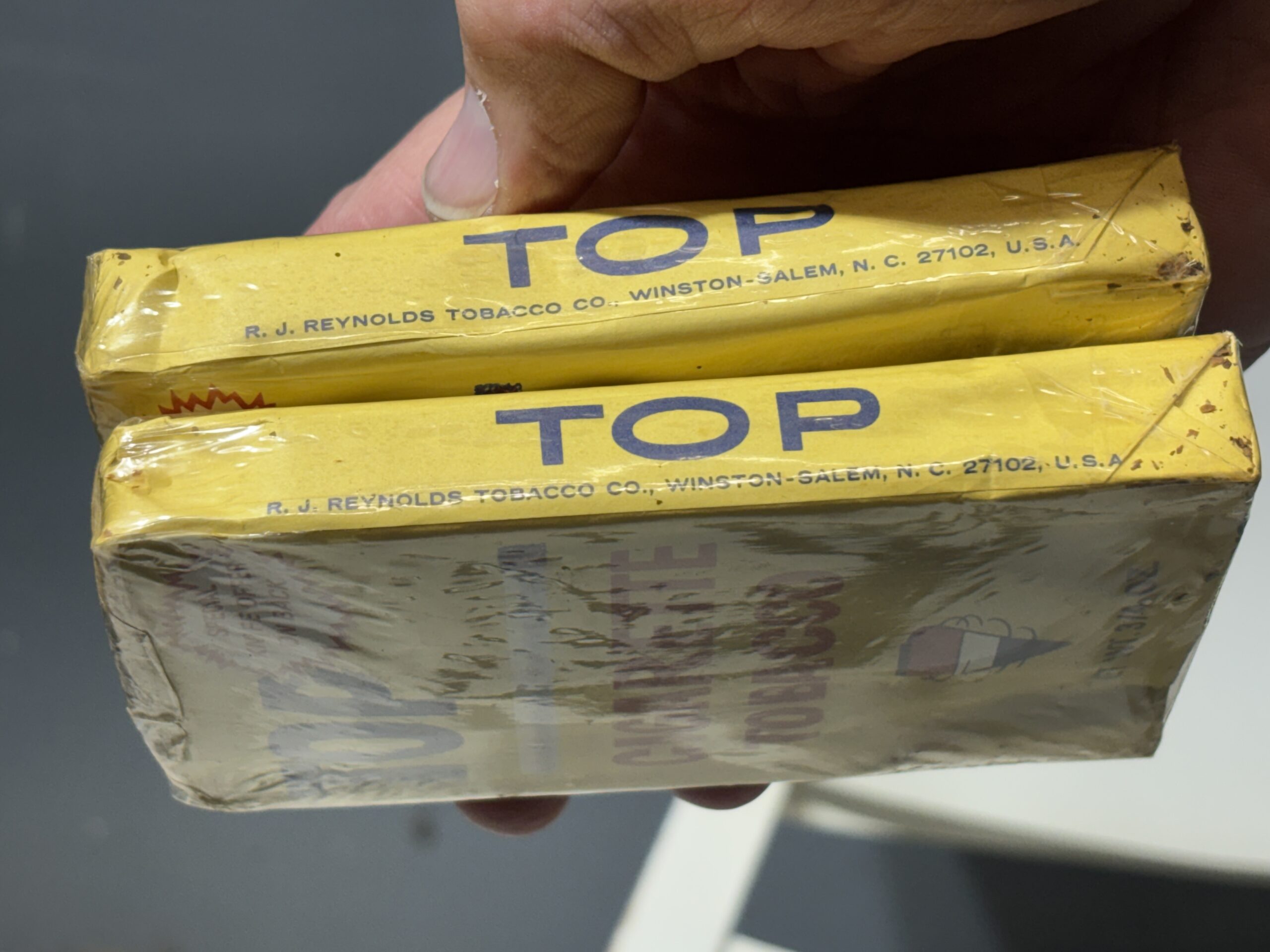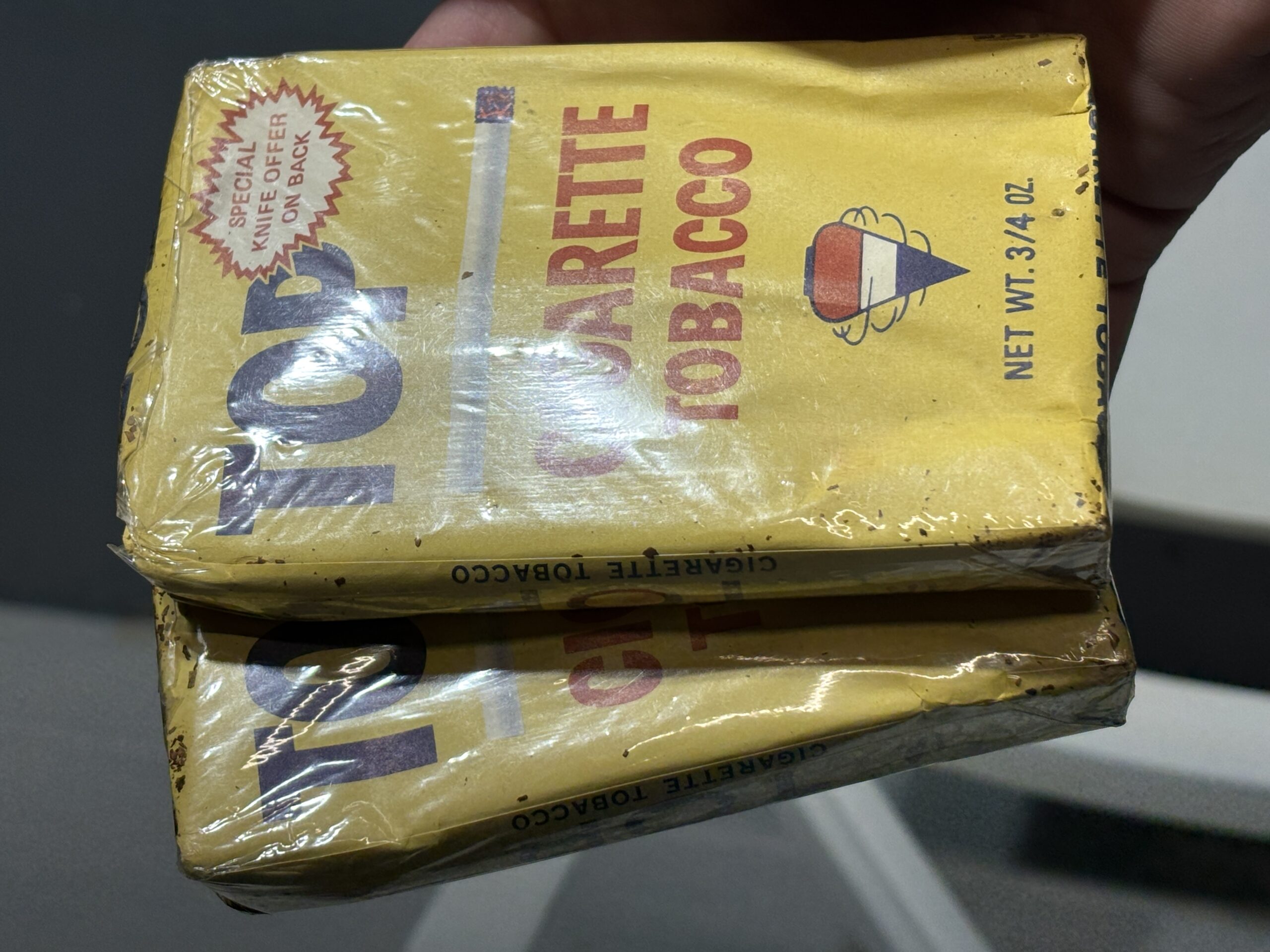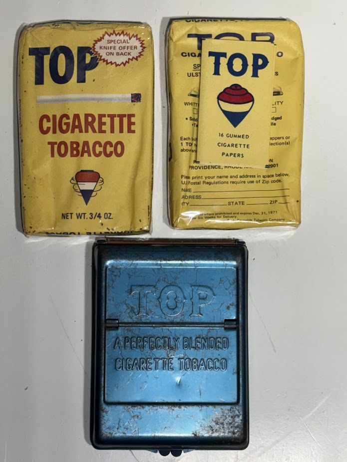 TWO Vintage 3/4 ounce TOP UNOPENED Cigarette Tobacco packages & a TOP Roller Blue Tin