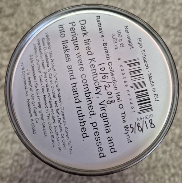 A 100g tin of Rattray's Hal O' the Wynd tinned in May 2018. Almost 8 years of age on this tin.