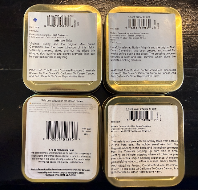 Up for auction is a nice sampler of Mac Baren tins. All 3.5oz tins except for the 2023 Latakia Flake, which is 1.75. One as old as 2009! LOOK!