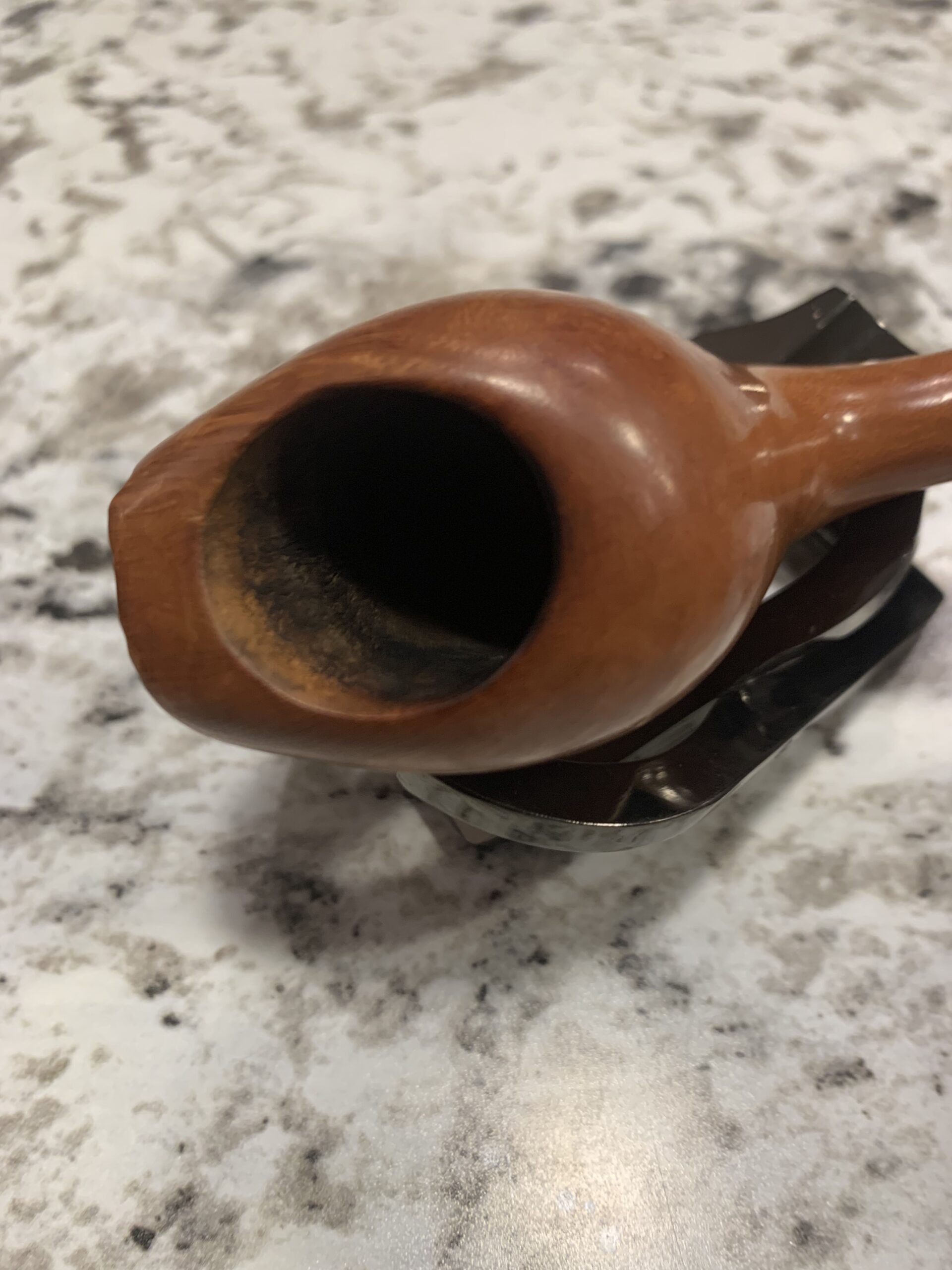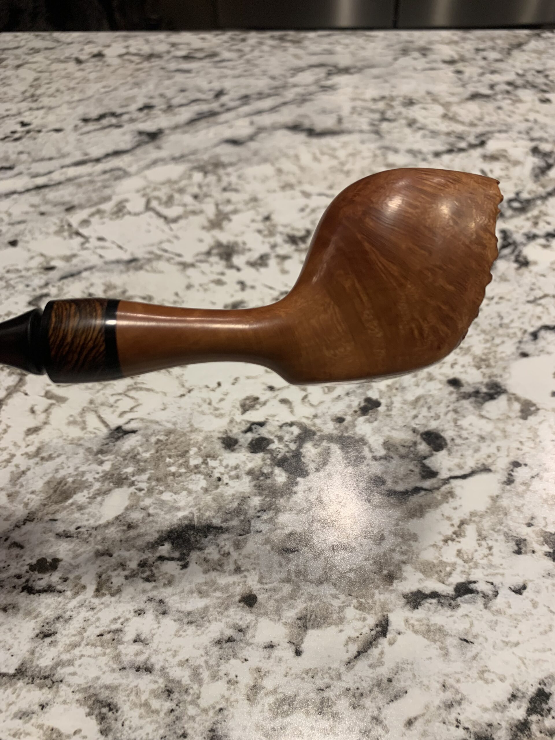 Beautiful smooth pipe with plateau and zebra wood accent ring. Gently smoked and very light weight. This would make a great pipe if your wanting to venture into the artisan pipe makers market.