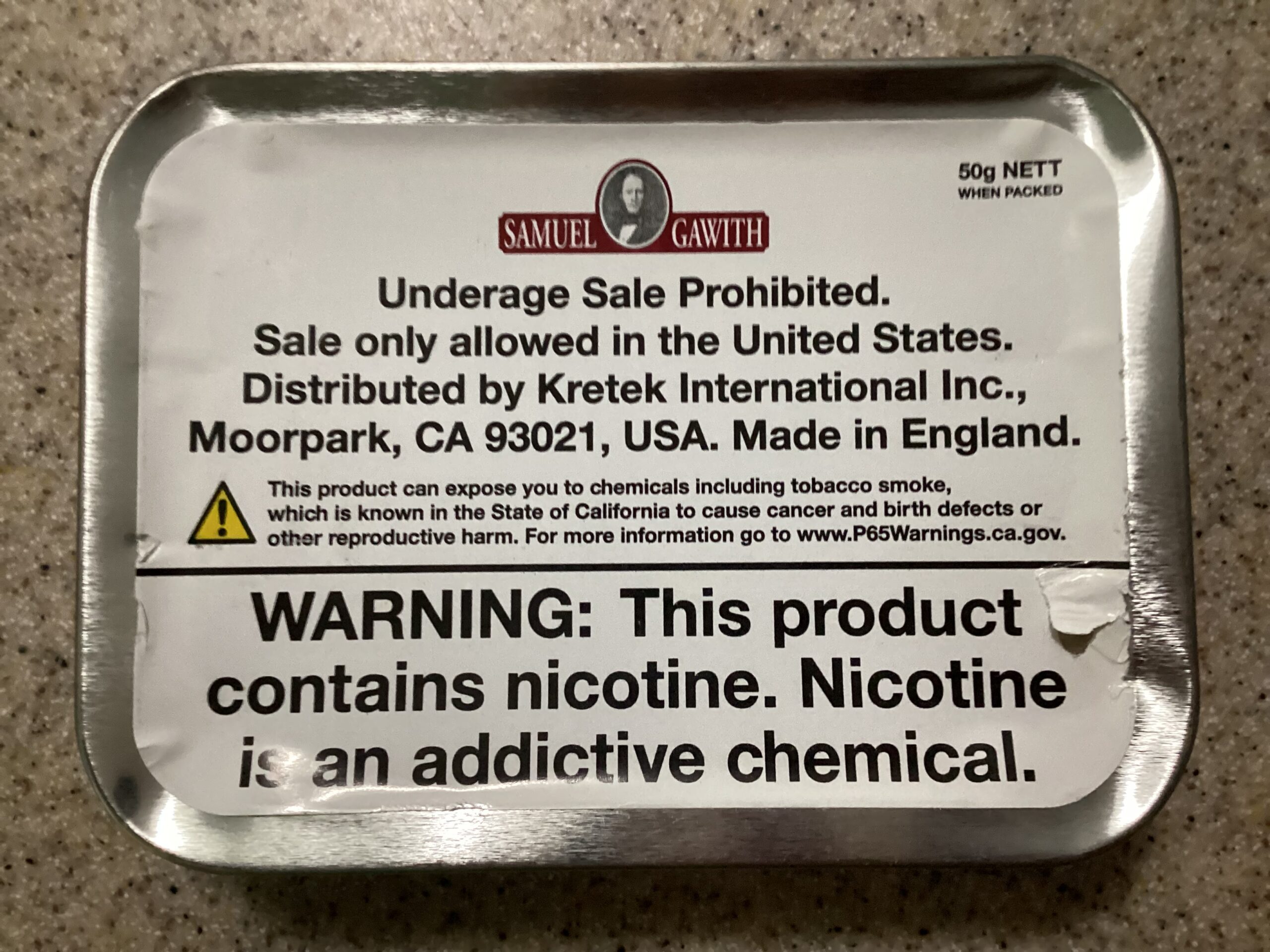 Based on the larger warning label and the British flag on the label, this tin is estimated from 2018. Tin is sealed and in good condition.