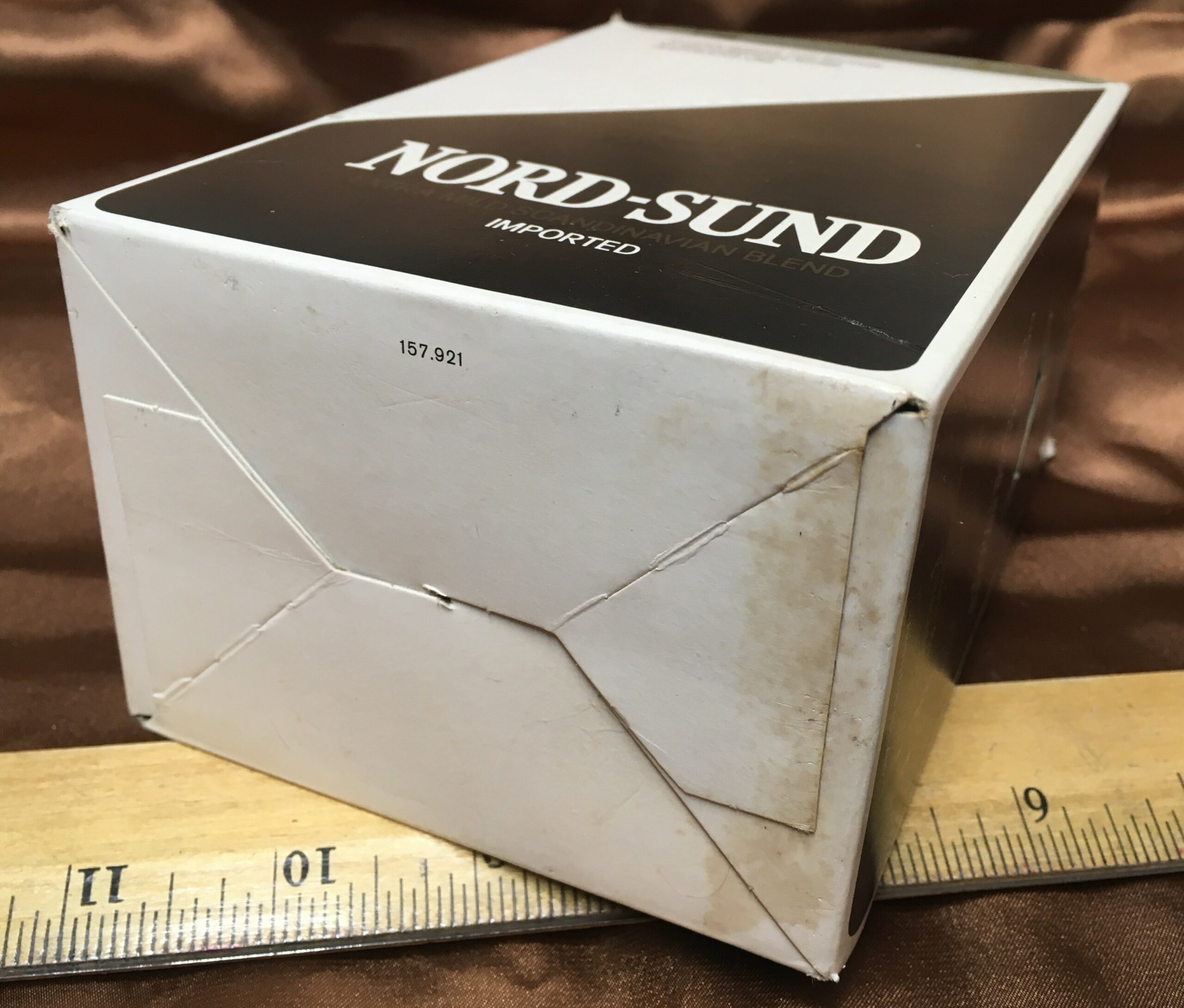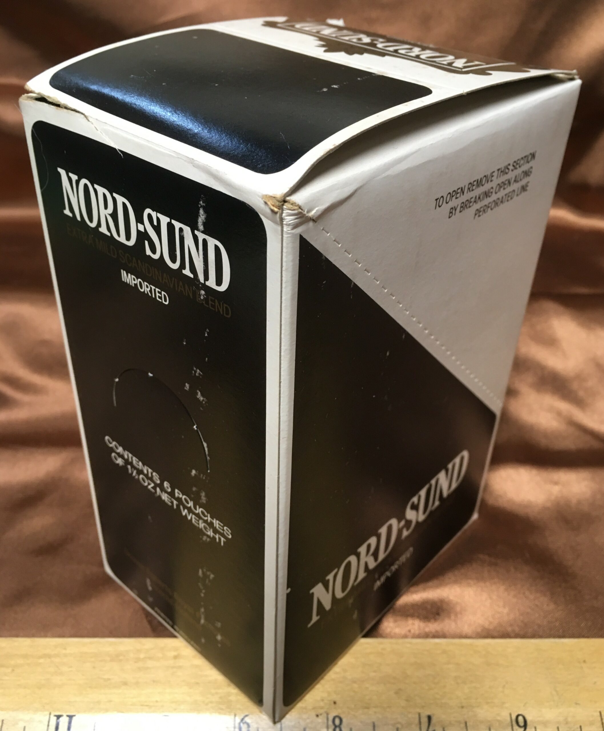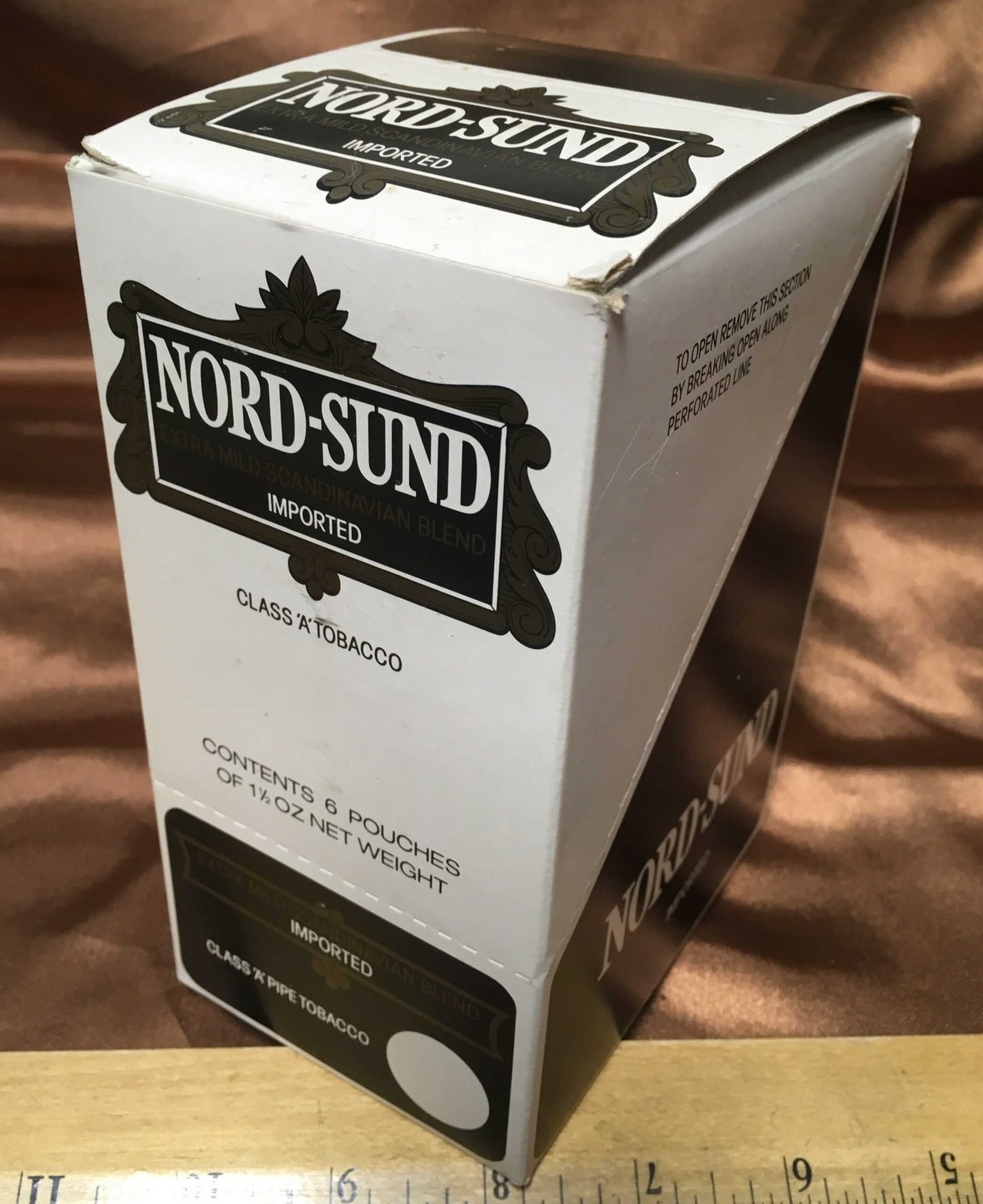 Vintage NORD-SUND, EXTRA MILD SCANDINAVIAN BLEND, IMPORTED Pipe Tobacco (1970s?) Break-Away Display Box containing Six (6) 1-1/2 oz Unopened Pouches.