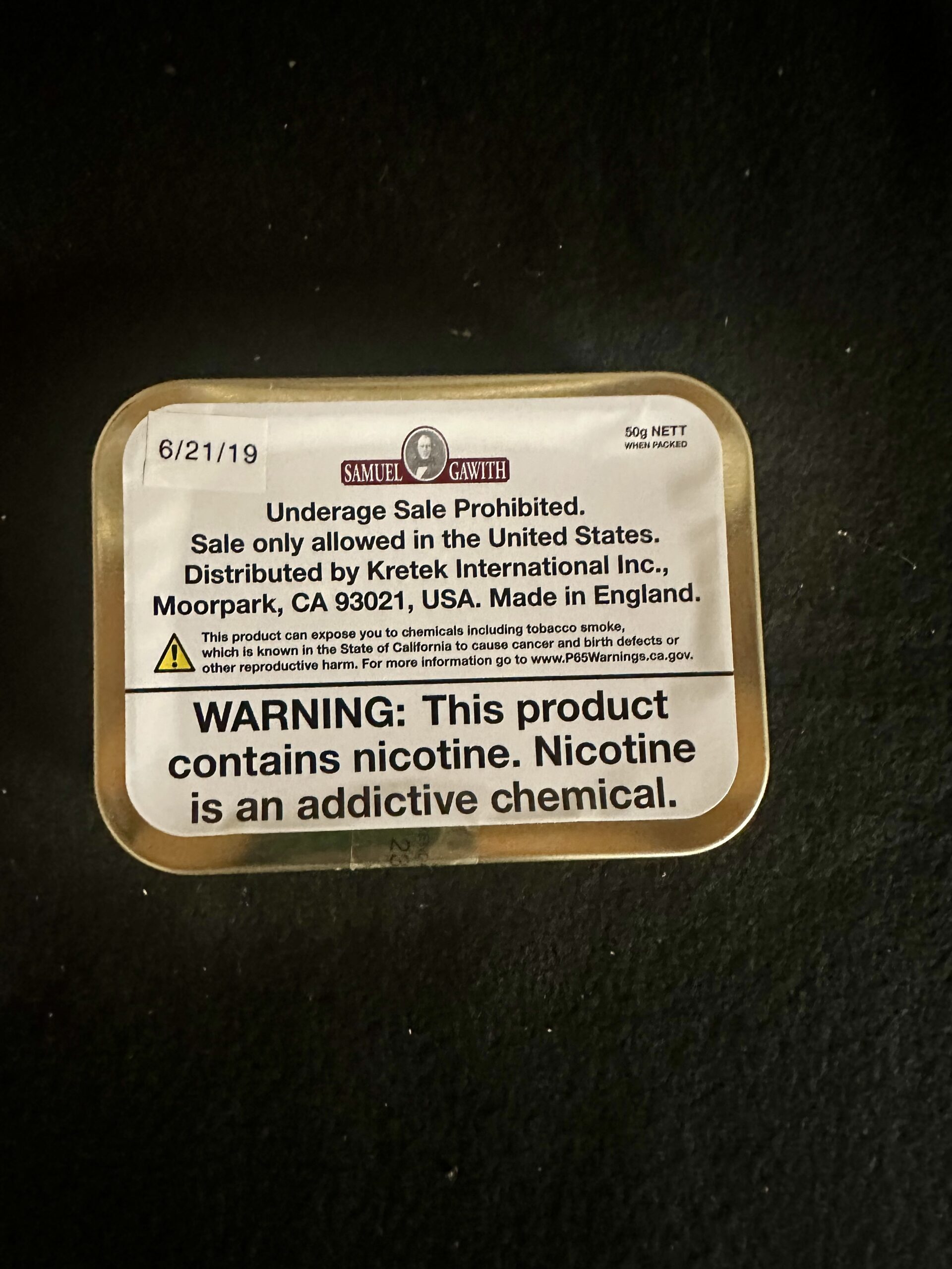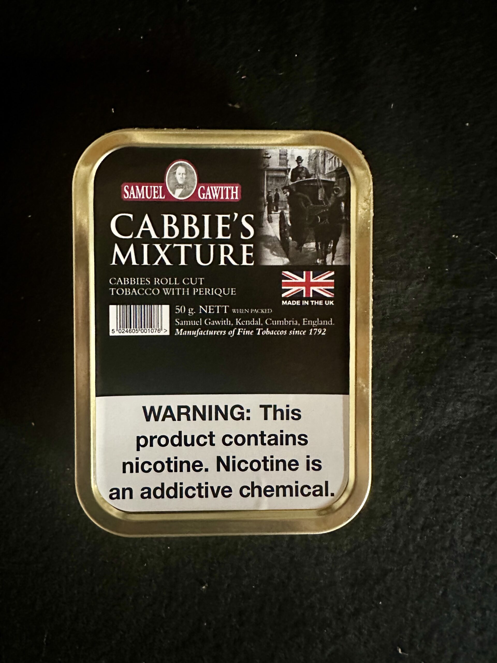 This auction is for a sealed tin of 2018 Samuel Gawith Cabbie’s Mixture.