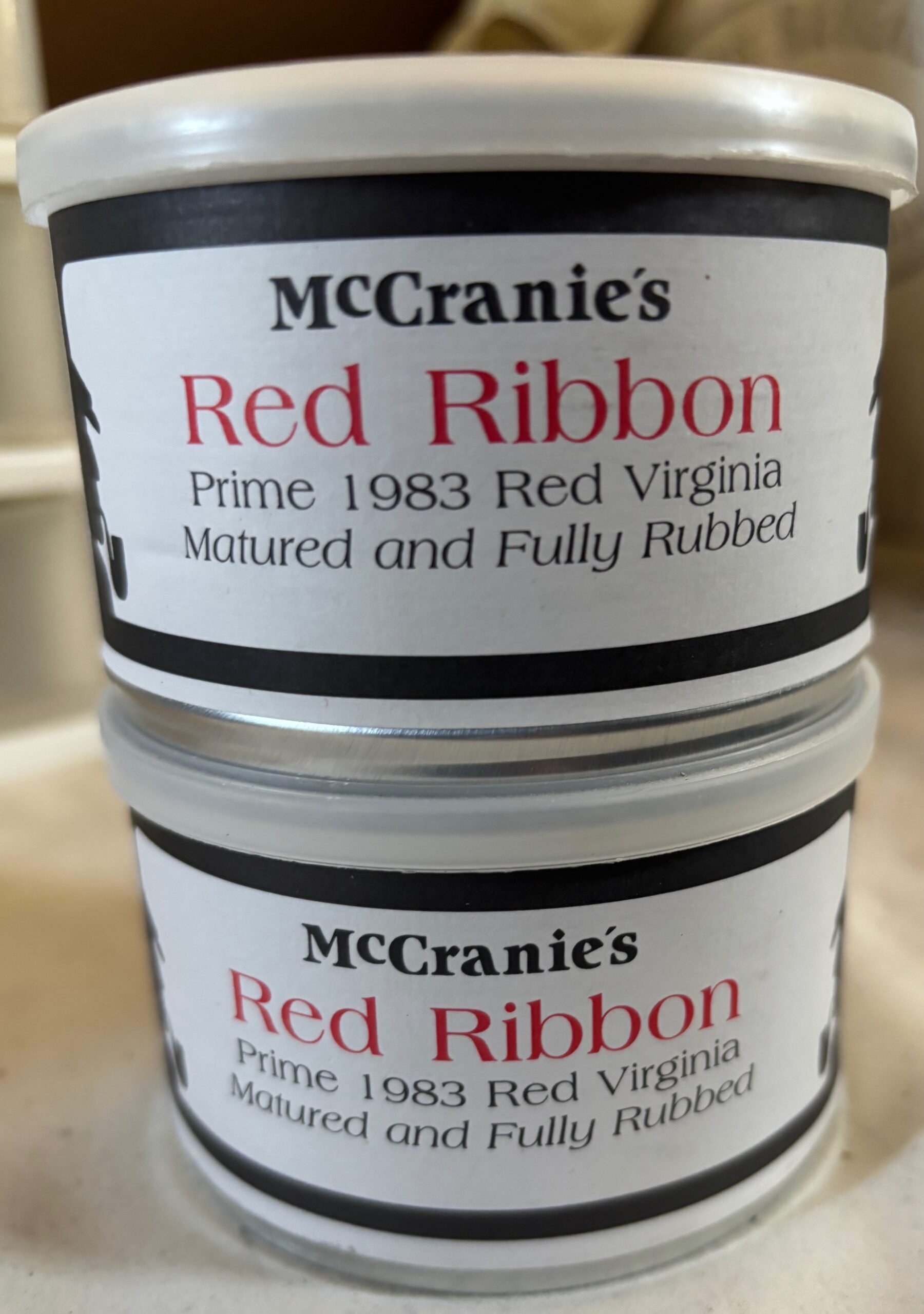 Two sealed 50 gram tins of McCranie's (made by McClelland), Red Ribbon 1983. The tins have been in cool, dry, and dark storage.