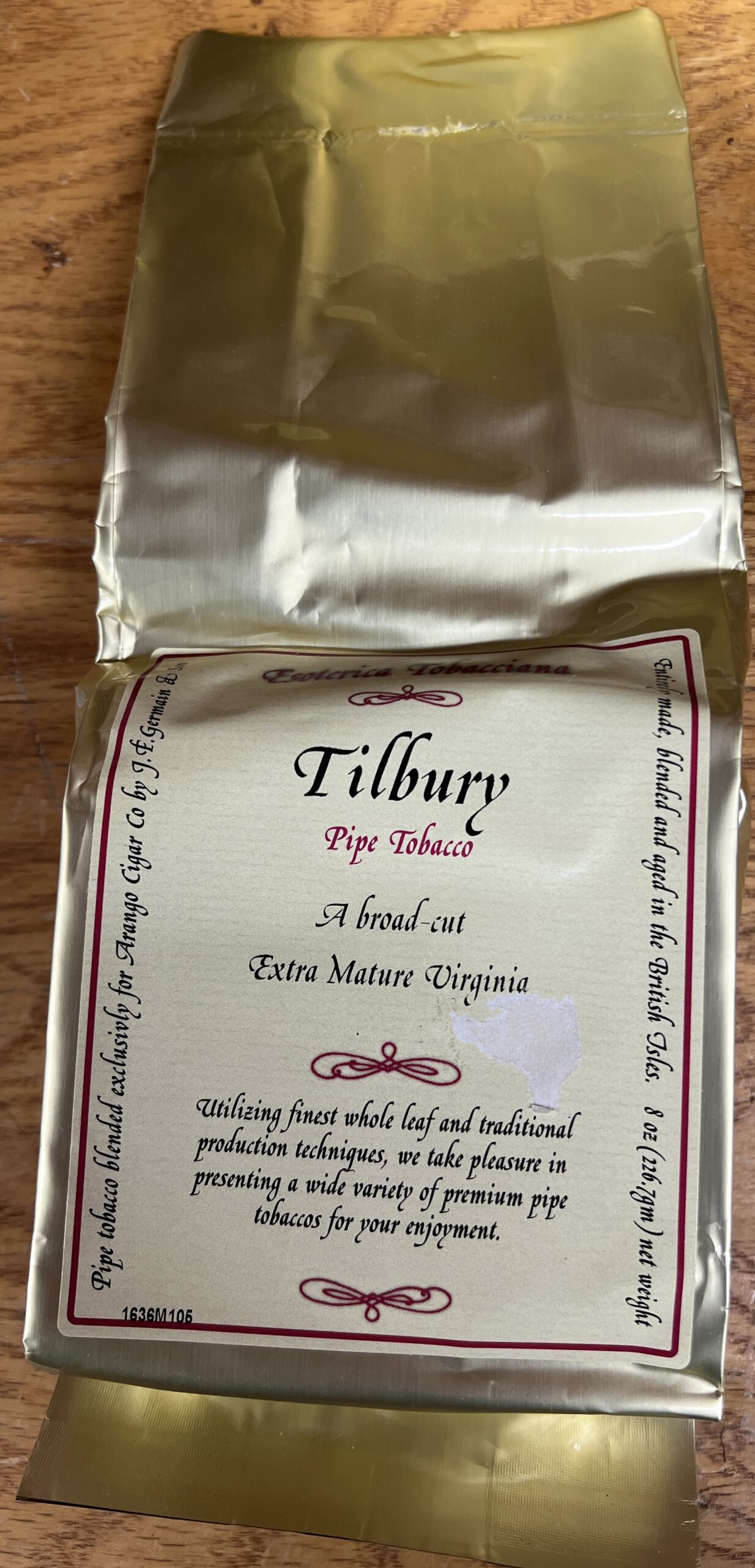 A harmonious blend of golden and dark Virginias with small portions of burley and air-cured leaf. Matured by a special process over 100 years old, producing a unique natural aroma and piquant flavor.