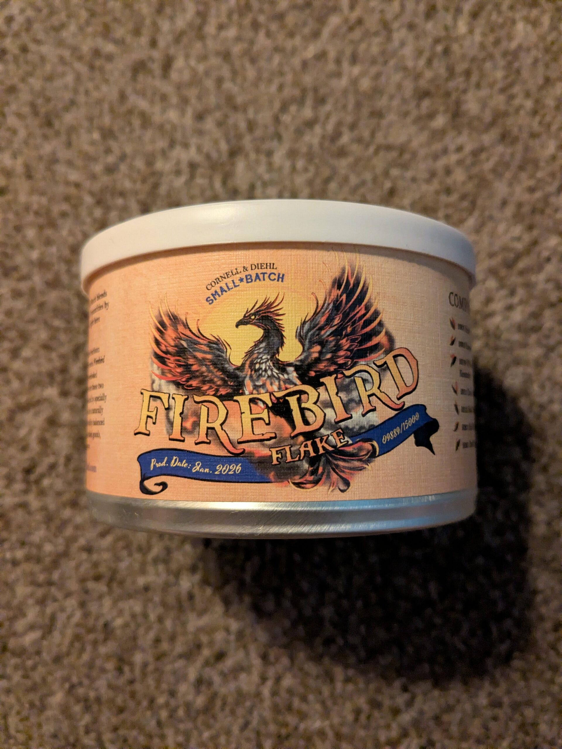 This auction is for a sealed 2oz tin of Cornell and Diehl's Firebird Flake from 2026.