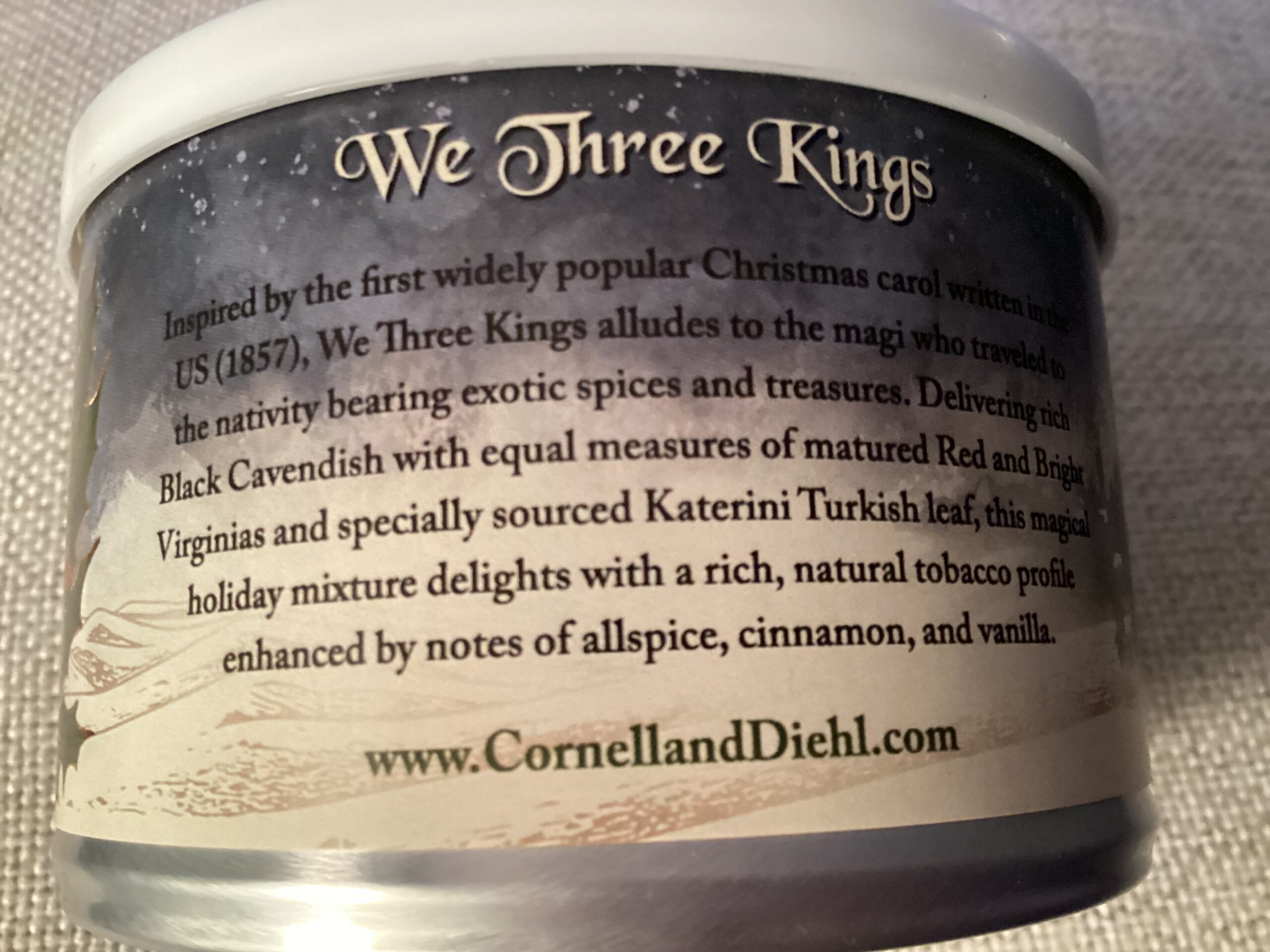 Cornell & Diehl’s 2025 We Three Kings is a lightly topped Virginia/Oriental blend, with notes of baked goods enhancing the flue-cured and sun-cured leaves' inherent sweetness and spice. A dark, confectionary tanginess mixes with richer brown sugar tones on the palate, elevated further by a slightly earthy and floral note — reminiscent of freshly baked cookies and other holiday treats.