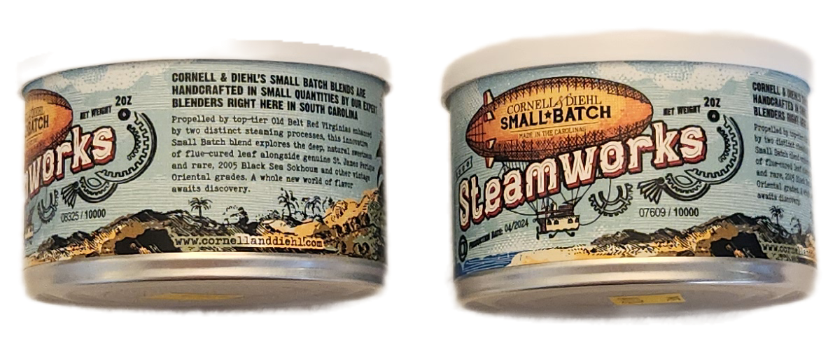 Two 2 oz sealed tins of Cornell and Diehl Steamworks, properly cellared