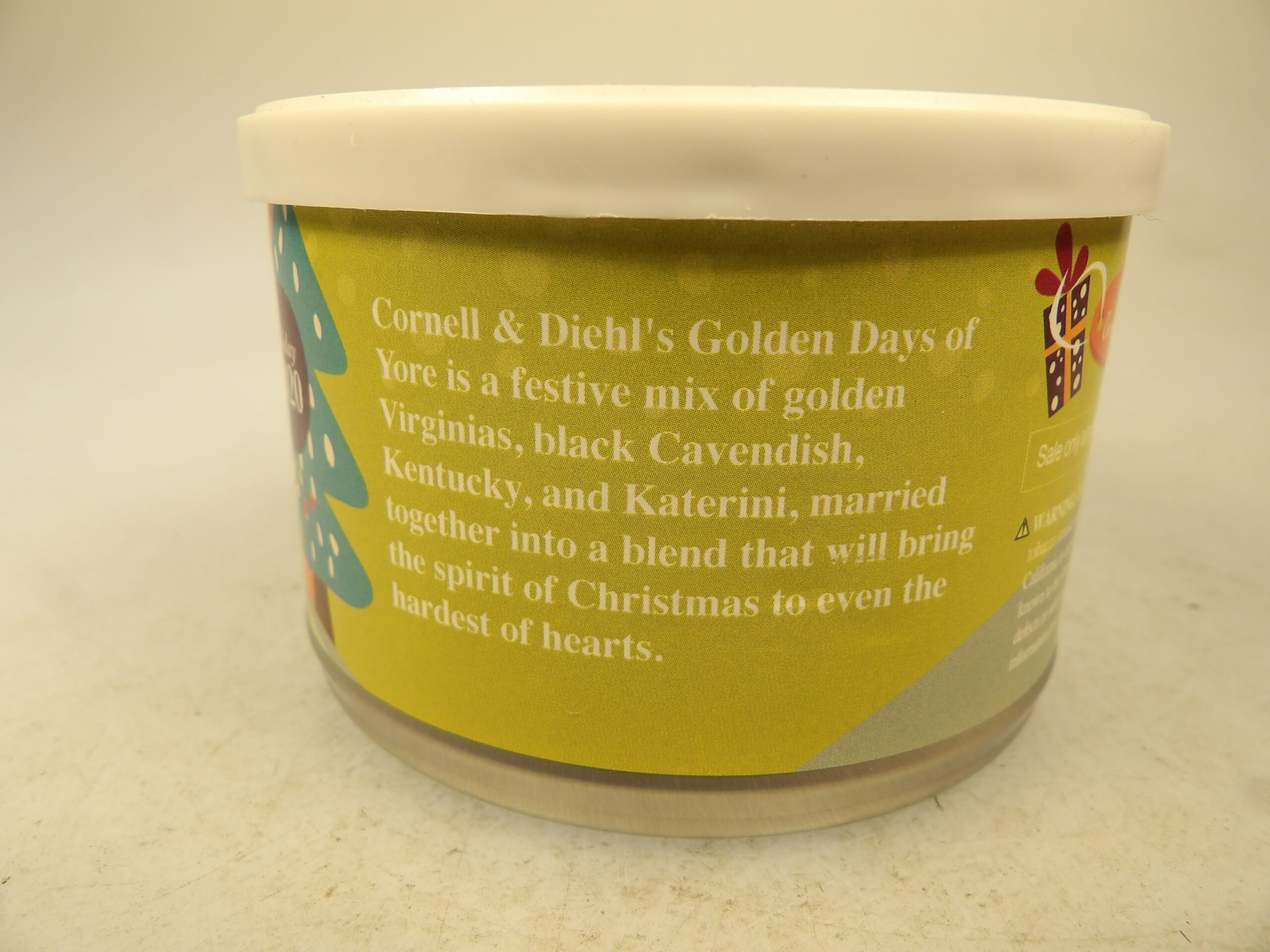 DESCRIPTION: Here is an auction for sale. It is a Vintage Collectible Tobacco Sealed Tin Cornell & Diehl Golden Days of Yore from 2020. Every year Cornell & Diehl produces a Christmas blend inspired by a classic Christmas carol. For 2020, they have hearkened back to those "golden days" with Golden Days of Yore — a festive mix of red and bright Virginias, Black Cavendish, dark-fired Kentucky and Katerini. A unique aromatic mixture, it's all married together with hints of ginger, nutmeg, allspice, cinnamon, and chocolate and topped with a dash of the best dark rum from Santa's secret stash. Good Luck Bidding and Thanks for Stopping by.