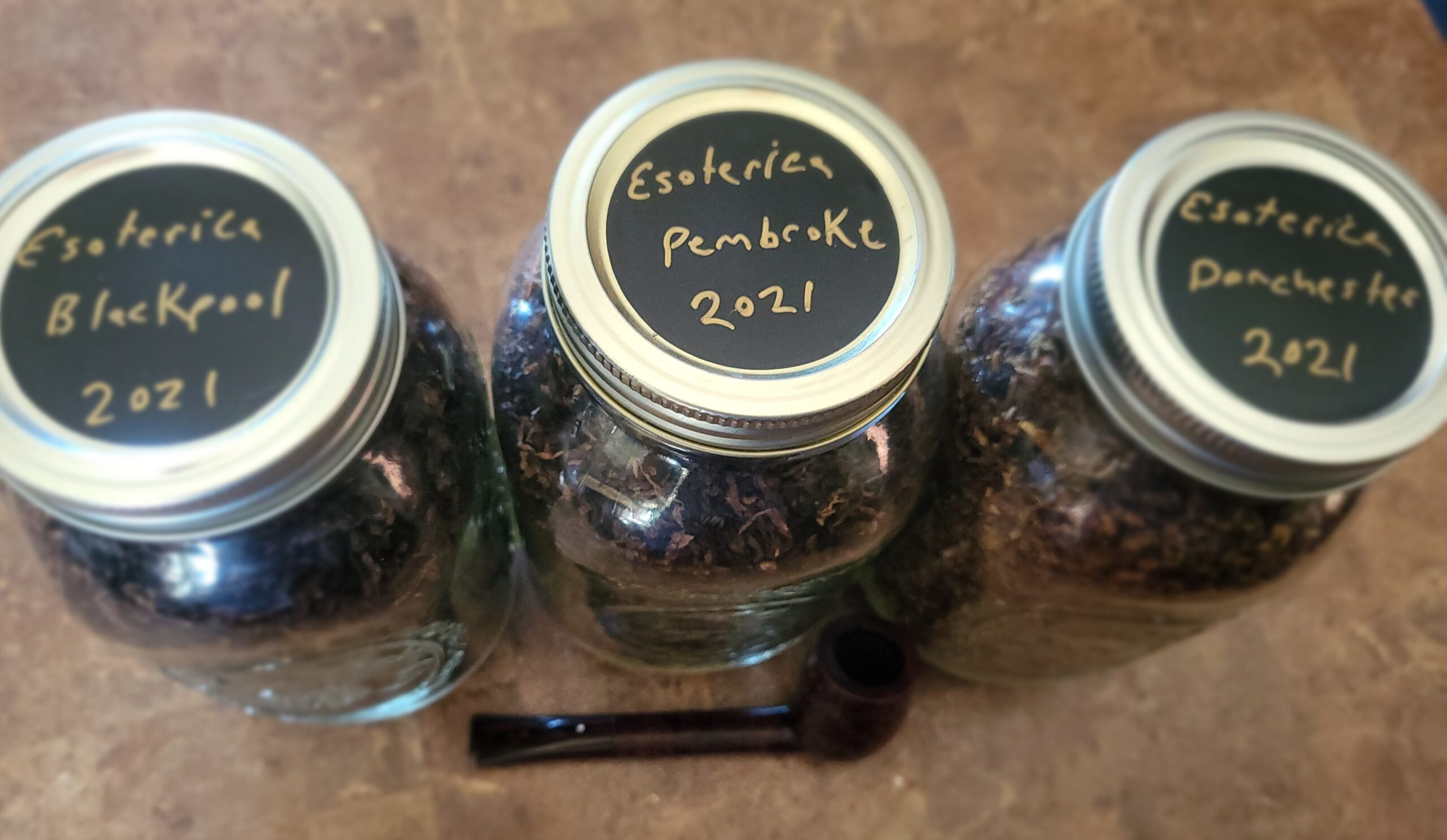This may or may not be my last purge this year. Three Esoterica Tobaccos 8 ounces each from 2021. Pembroke, Dorchester, and Blackpool. Put in new and sanitized jars, gloved hands, sterile funnel. Placed in back of cool dry tobacco cellar, and forgotten. Lot will come with jars which have remained unopened and without tobacco taken from them. Also included is a Dunhill group 2 Billiard with beautiful grain which seller knowingly sold me with an internal bowl fracture. It is small and not completely through the bowl crack. It's ready to smoke by someone that smokes lightly and actually cares for their pipes.