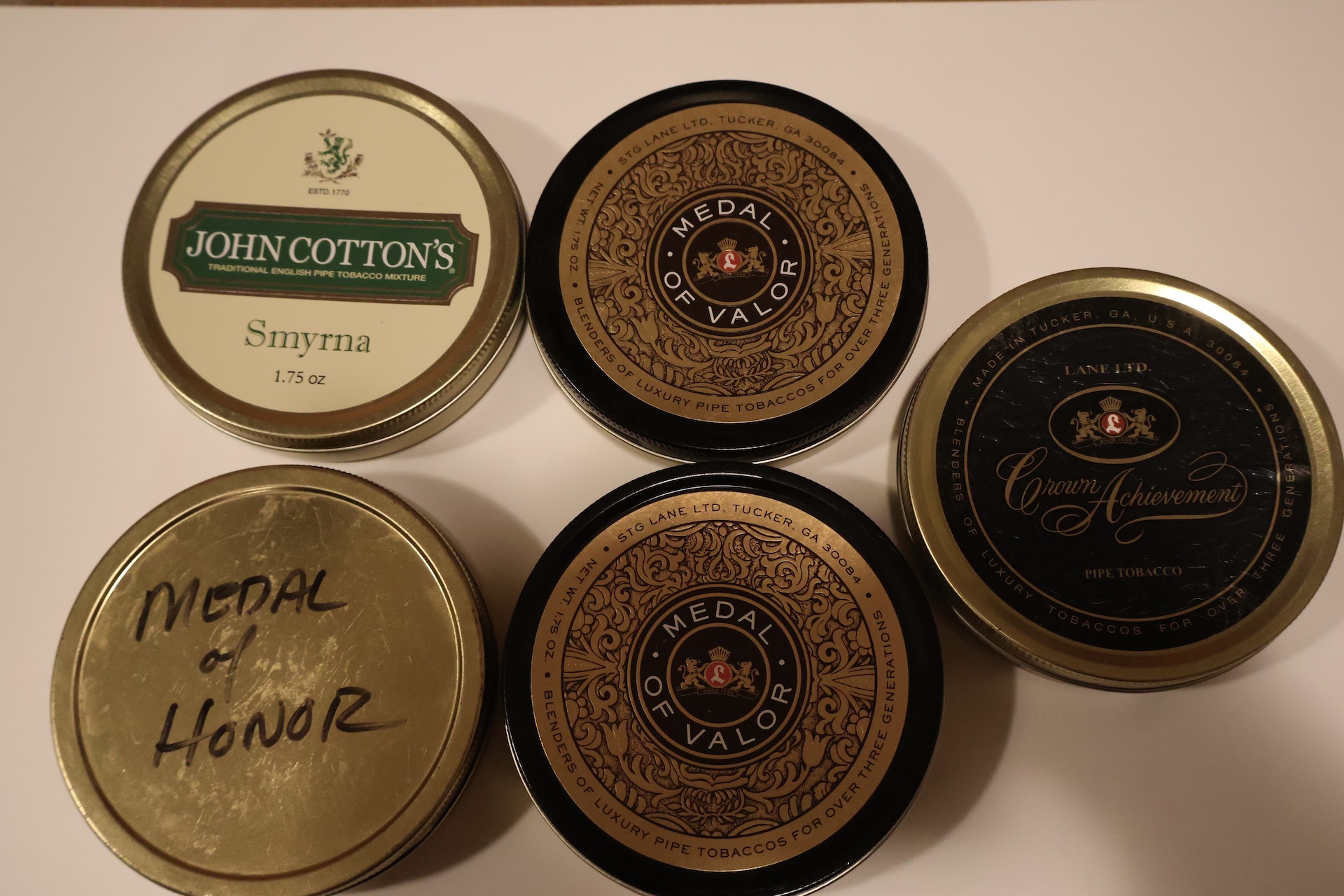 Three cans of medal of honor(one missing a label) and one each of crown achievment and john cotton smyrna. Not sure how old.