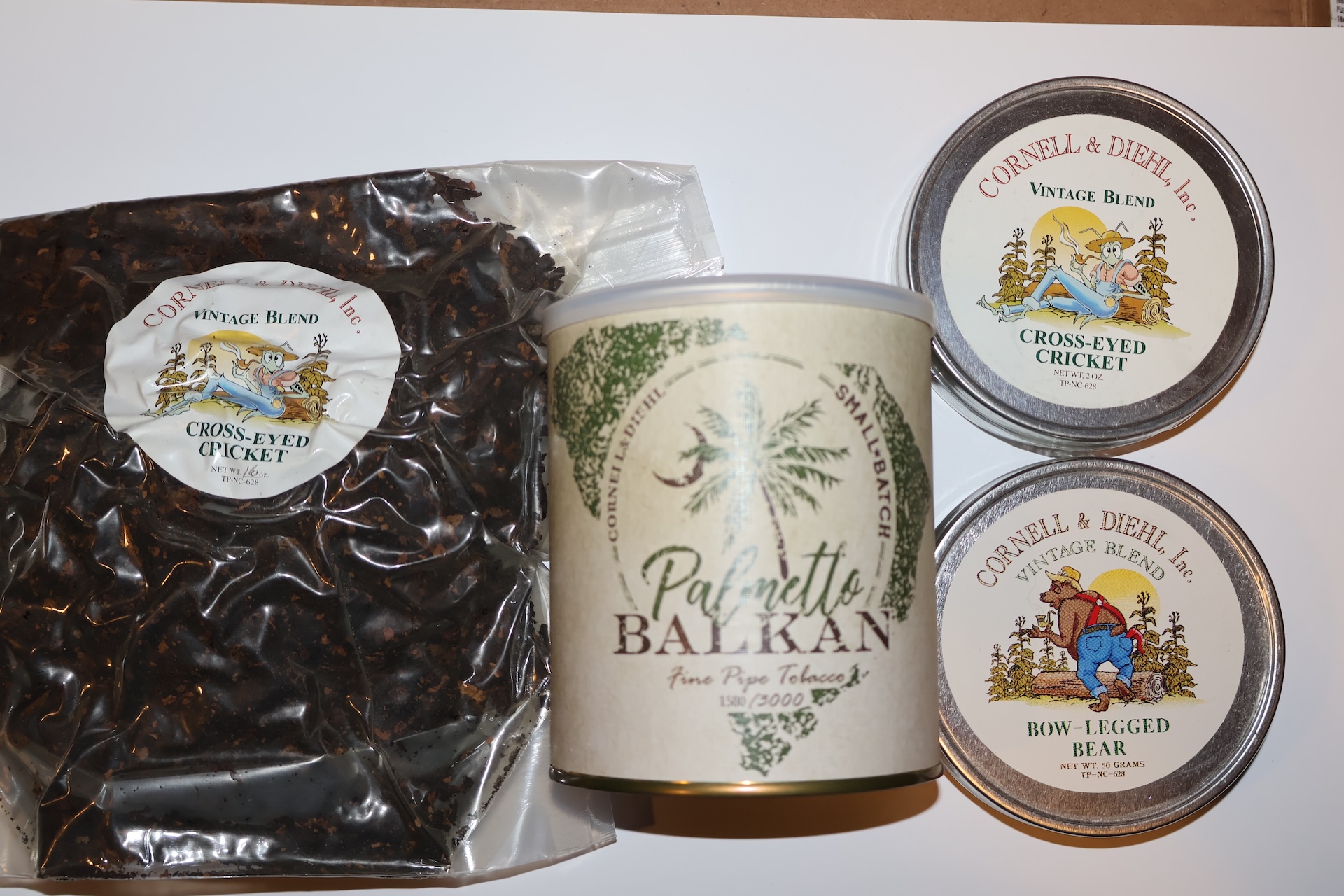 one 1 lb of cross eyed cricket age unknown , Palmetto balkan 8oz 2022, Cross eye cricket 2oz 2000, Bow legged bear 2oz date unknown but old.