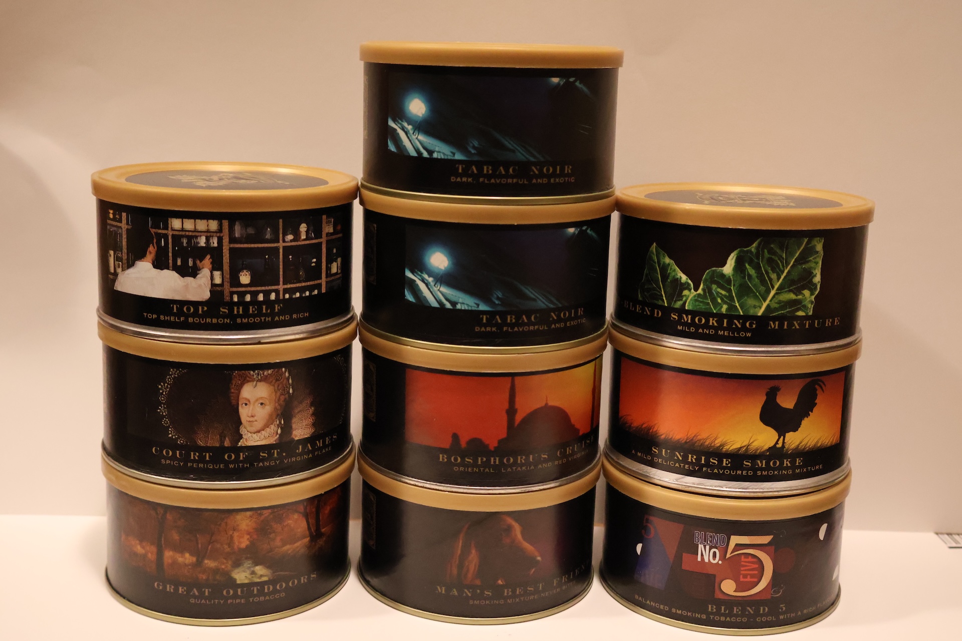 one each 1.5 oz. Sunrise smoke,no5, Tabac noir( x2), Man's best friend, R-blend, Bosphorus cruise, Top shelf, Court of st James, Great outdoors