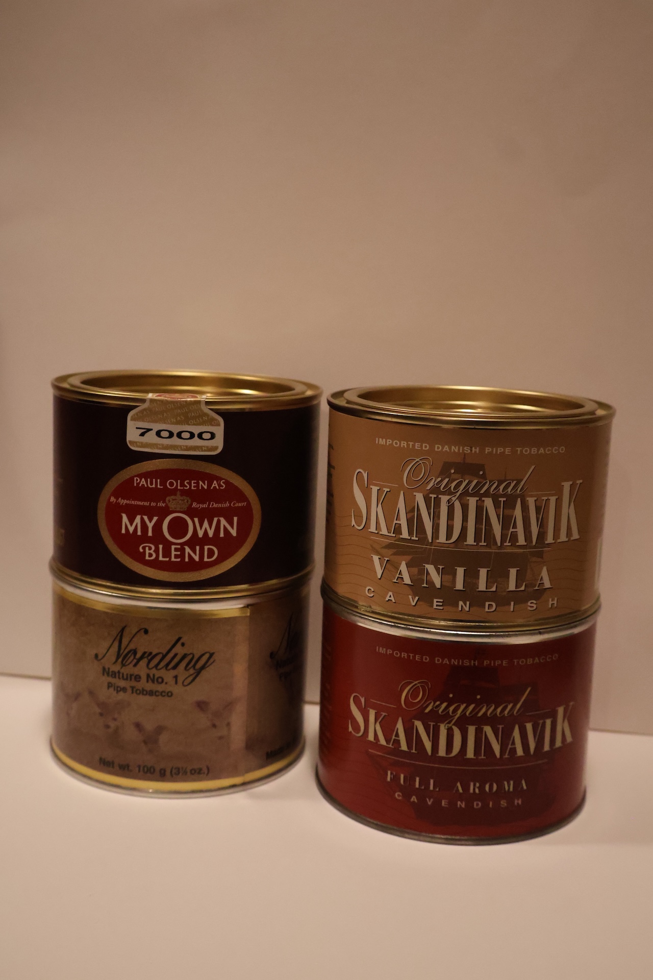 one each 100gr tins- nording no 1, Paul Olsen 7000, Skandinavik full aroma and vanilla cavendish