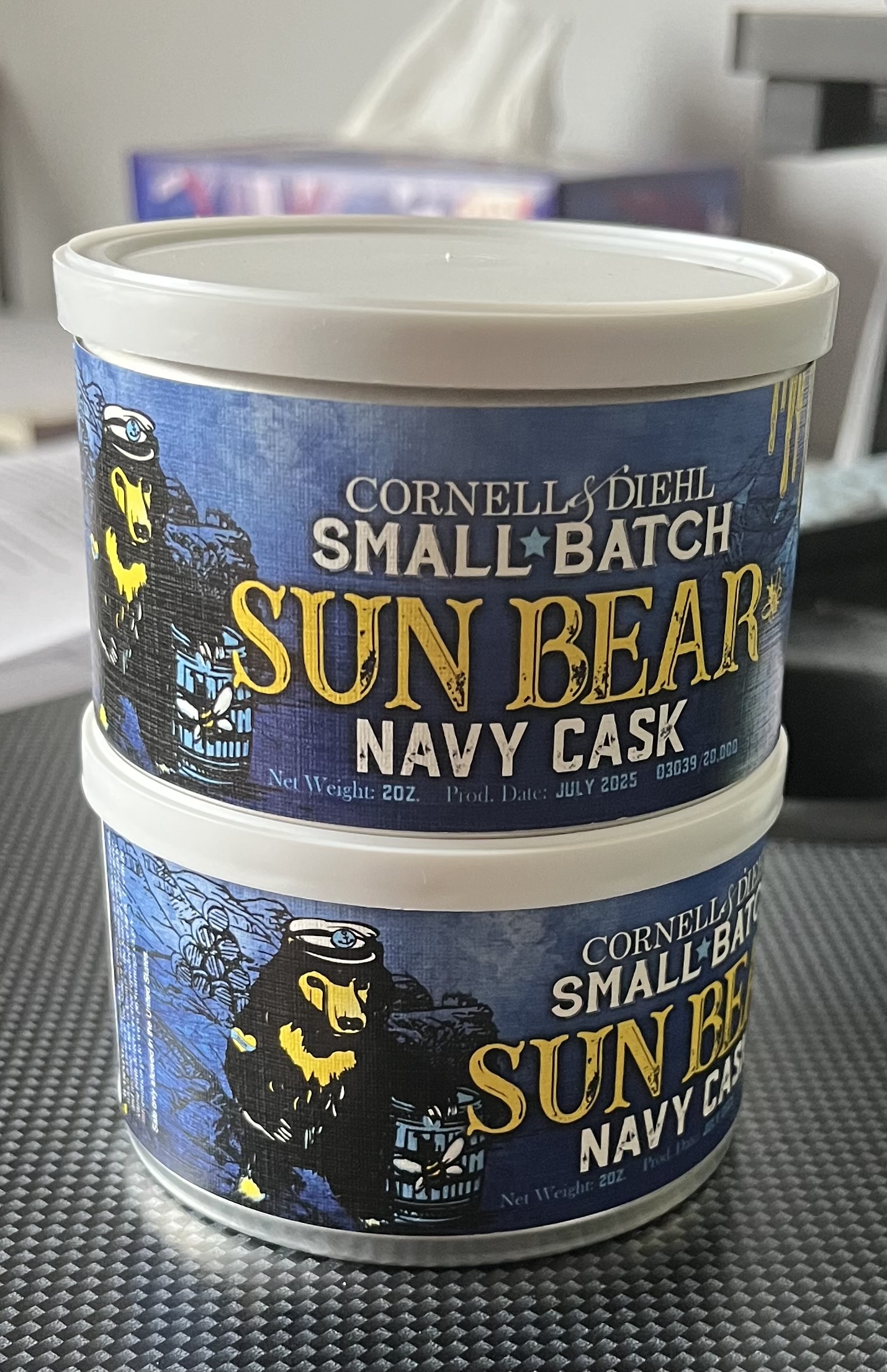 Sun Bear Navy Cask builds upon past releases and features a blend of Red and Bright Virginias balanced by choice 2020 Thai and 2018 Turkish Izmir grades. Raw, rum-barrel-aged wildflower honey — matured for a year and accented by silver tequila and elderflower — rounds out the blend and introduces a boozy complexity to the classic Sun Bear profile. The result is a deep, naturally sweet mixture with barrel-aged notes of vanilla, charred oak, and toffee.