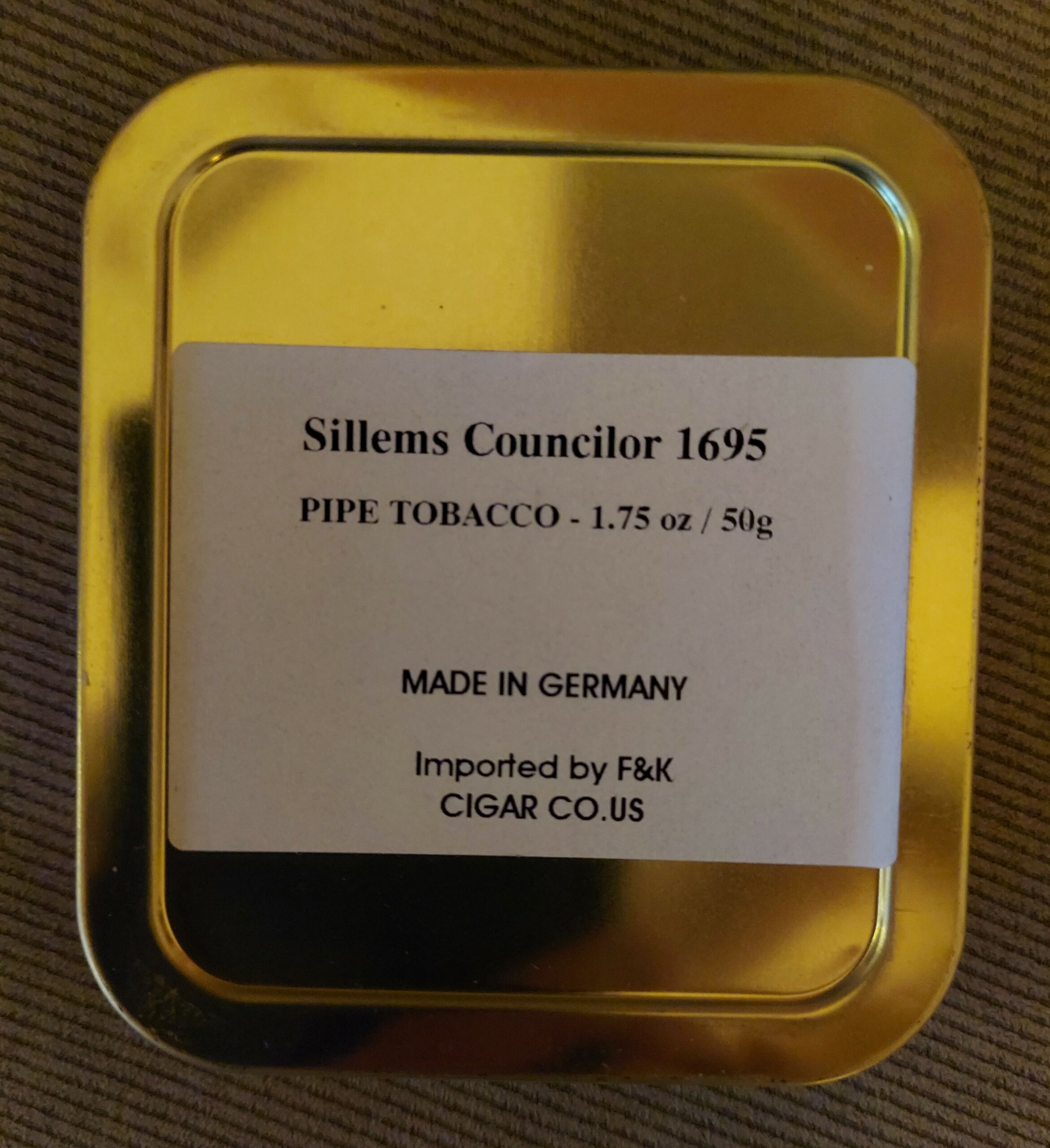 50g tin of Sillem’s Councilor 1695. This is a great well aged VaPer. It does not have a date code but I purchased it in December 2011.