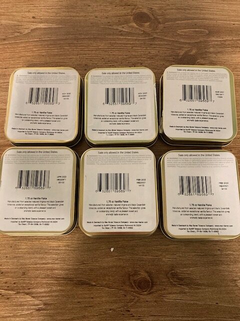 Six 1.75 oz (50 gram) tins. That works out to 10.5 oz or about 300 grams of tobacco. This blend is great, there is a lot of high-quality Virginia here and a nice vanilla topping that does not overwhelm the tobacco flavor. This is sweeter than MacBaren Vanilla roll cake but less sweet than the Loose Cut. This is no longer made. I'm working my way through a tin from 2018 now and the Virginia is great, figgy and rich, and the vanilla is still there. An exception to the rule on aromatic aging. This is a very light aromatic- I would call it a Virginia/Burley crossover blend. No reserve.