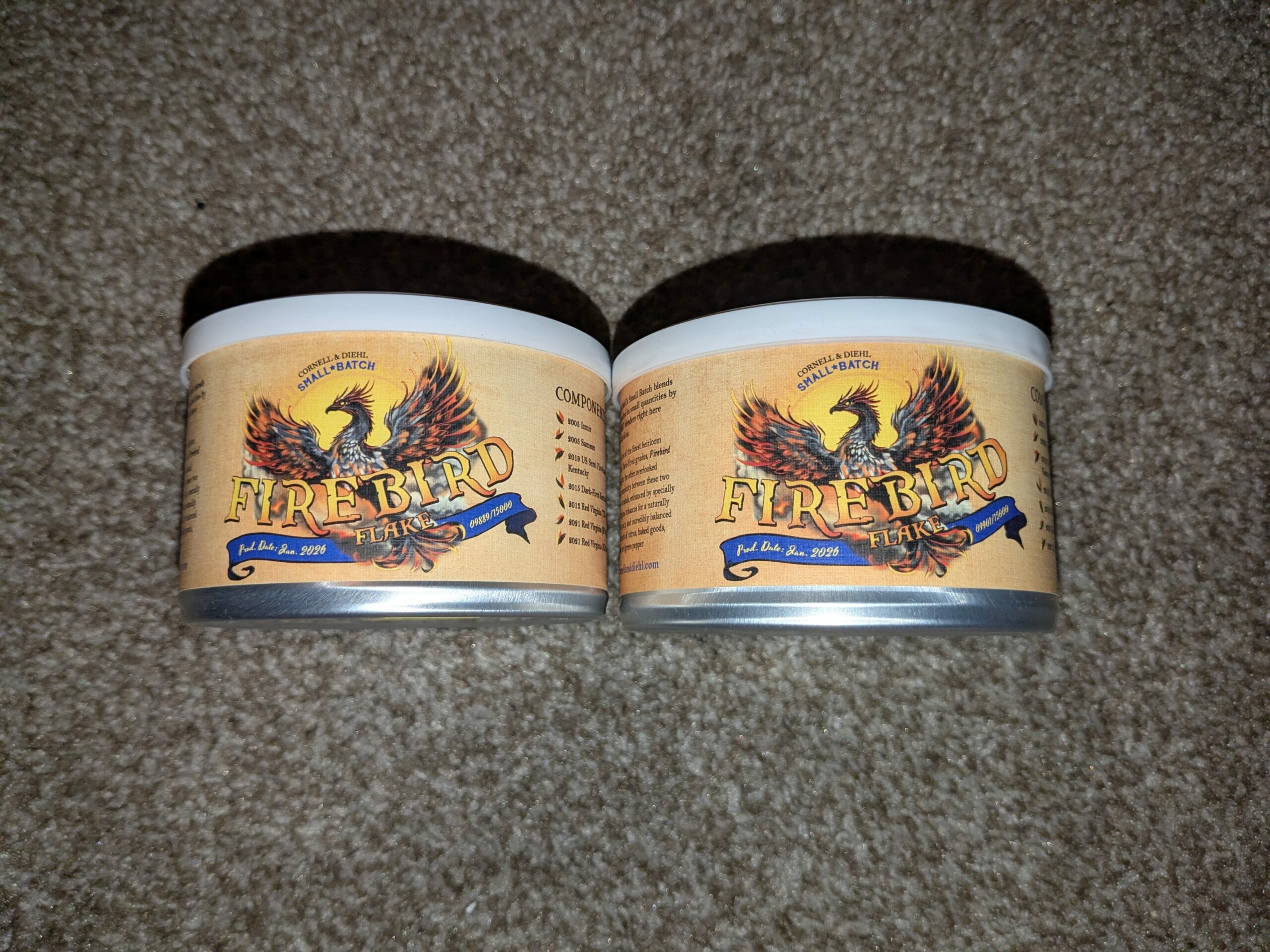 This auction is for TWO sealed 2oz tins of Cornell and Diehl's Firebird Flake from 2026.
