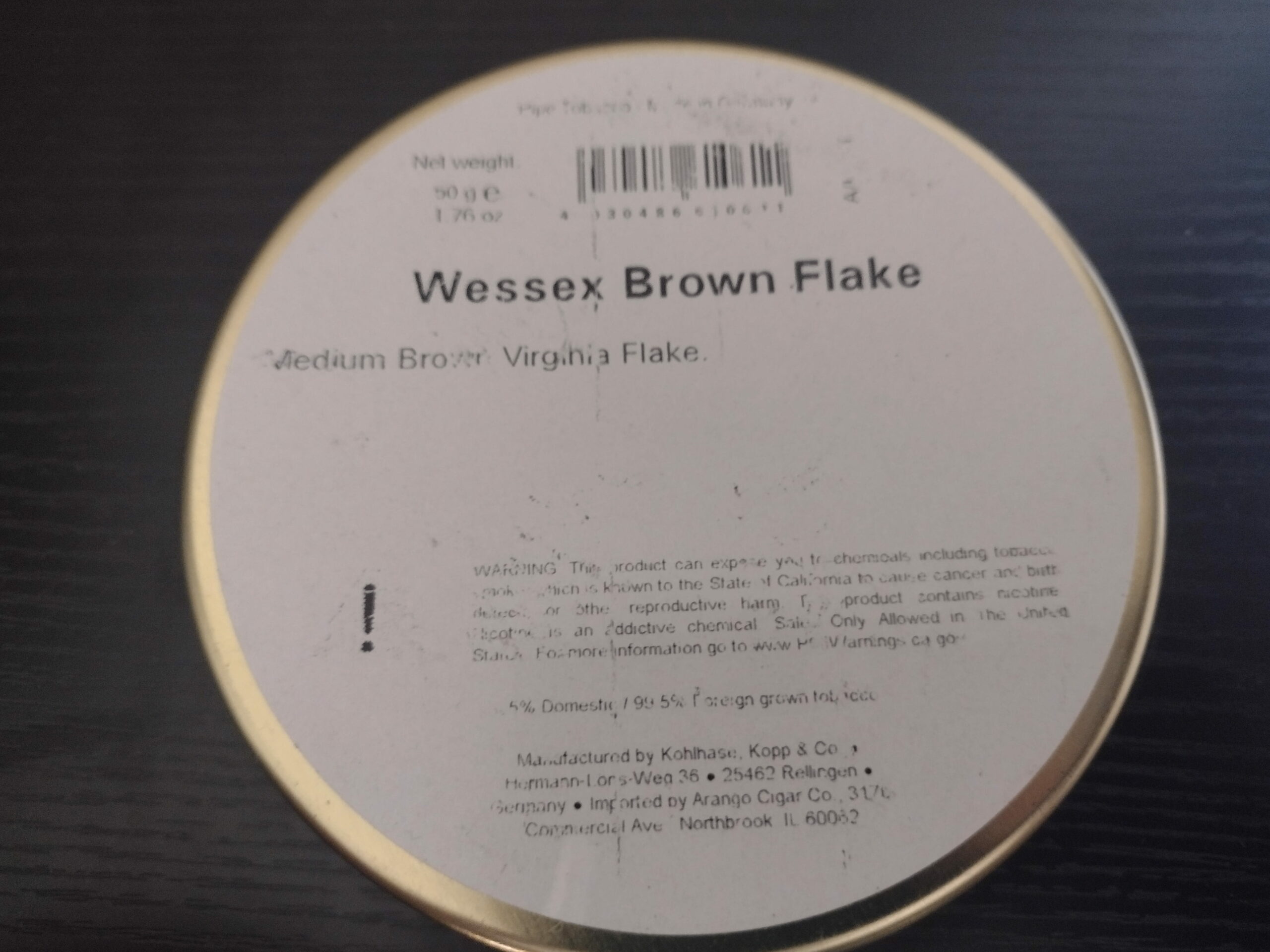One sealed tin of Wessex Brown Virginia Flake, purchased new in January of 2021. Stored in a climate-controlled environment.