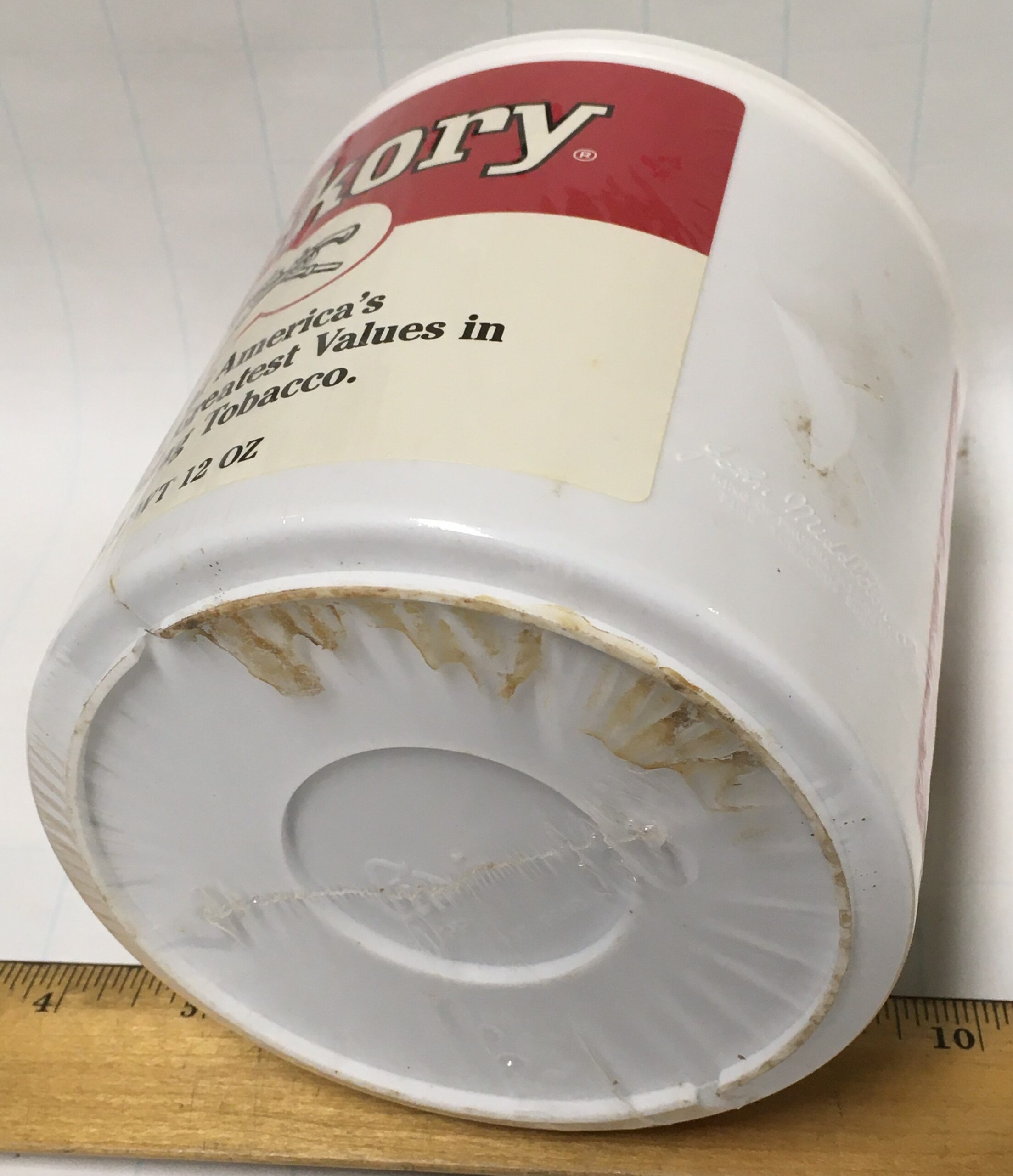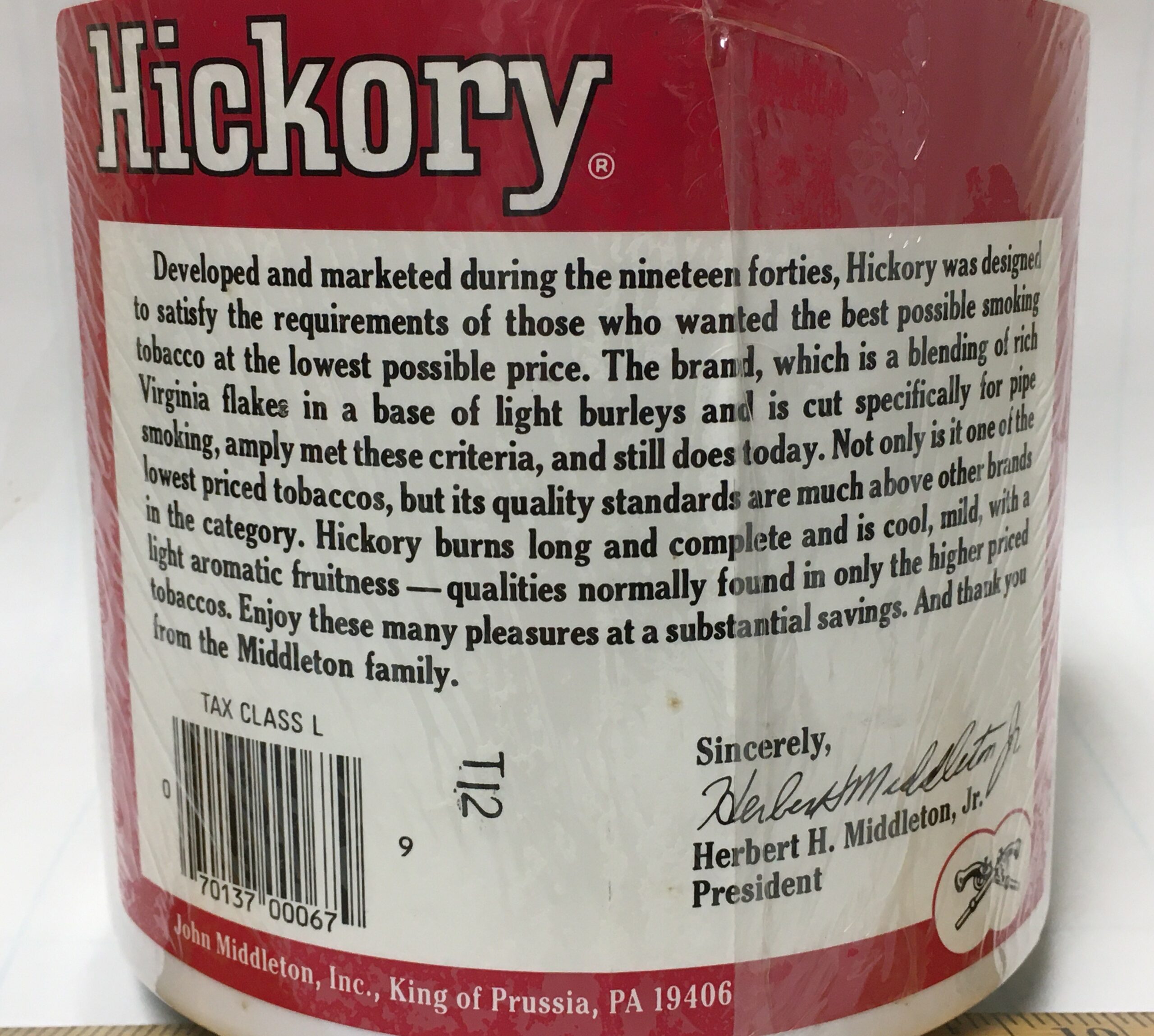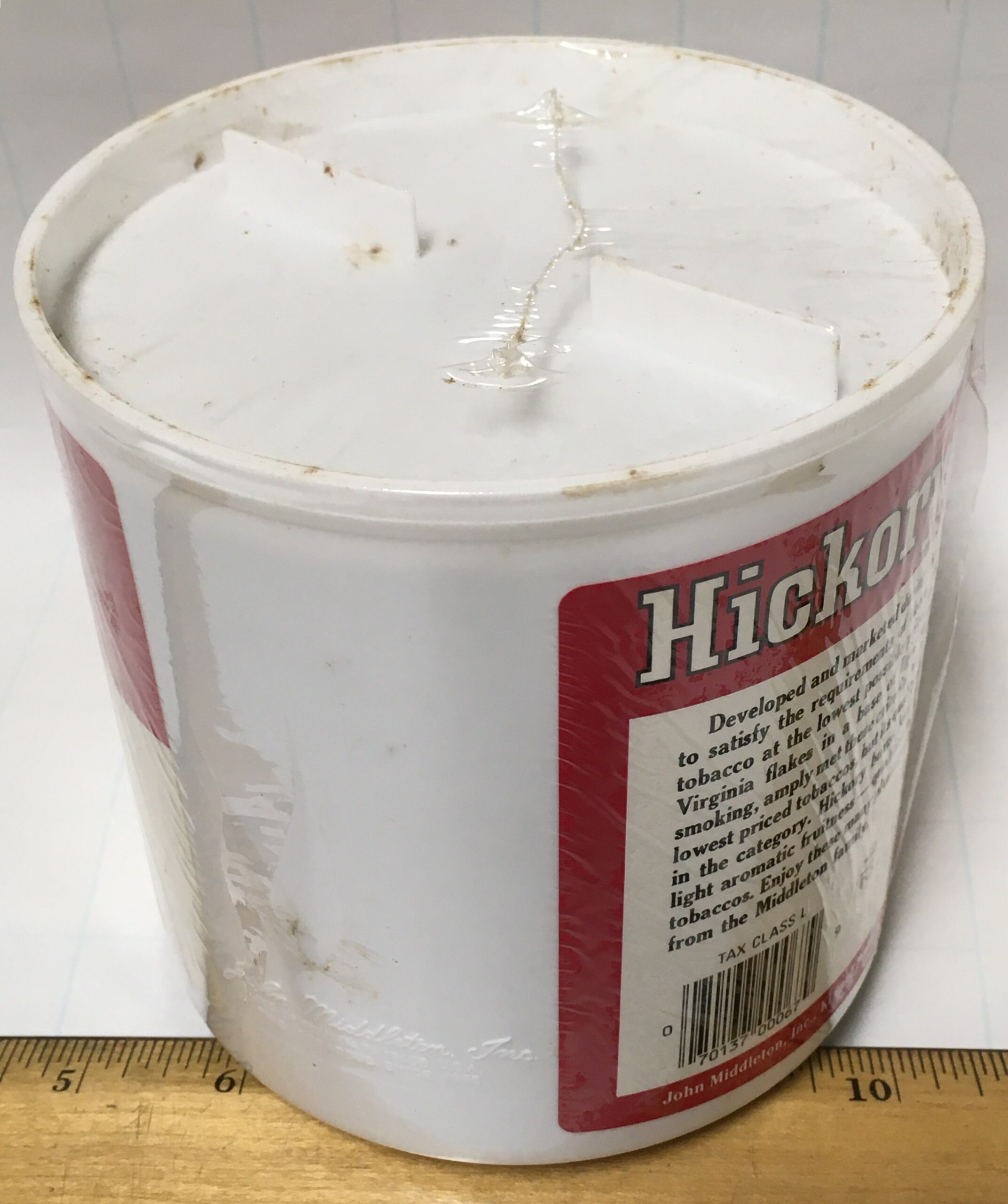 Vintage John Middleton's HICKORY Pipe Tobacco (1980s?) in 12oz sealed can. The clear layer of plastic wrap is compromised in places, trapping some dirt, and the wrap is stained on the bottom. All of this will be easily wiped from the can, once Buyer removes the aged cellophane. Older plastic cans of this type usually remain sealed VERY well from the factory.