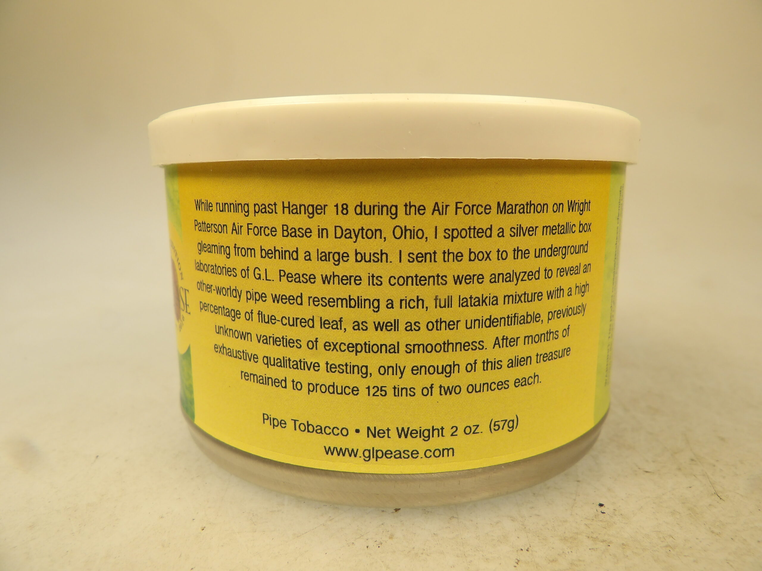 DESCRIPTION: Here is an auction for sale. It is a Vintage Collectible 10 Years Old G.L. Pease NASPC Invasion 2 oz’s Pipe Tobacco Tin Annual 2016 Show. This tin is sealed and has never been opened. While running past Hanger 18 during the Air Force Marathon on Wright Patterson Air Force Base in Dayton, Ohio, I spotted a silver metallic box gleaming from behind a large bush. I sent the box to the underground laboratories of G.L. Pease where its contents were analyzed to reveal an other-worldly pipe weed resembling a rich, full latakia mixture with a high percentage of flue-cured leaf, as well as other unidentifiable, previously unknown varieties of exceptional smoothness. After months of exhaustive qualitative testing, only enough of this alien treasure remained to produce 125 tins of two ounces each. Good Luck Bidding and Thanks for Stopping by.