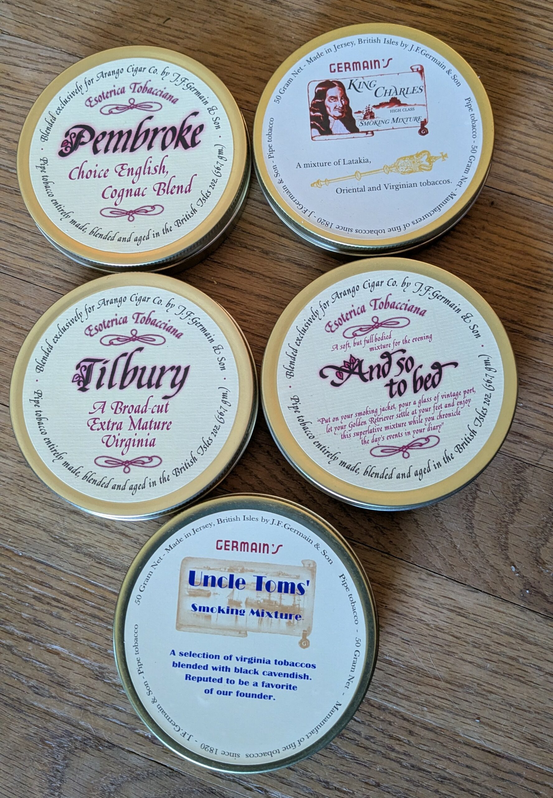 Sealed tins: 2x Balkan Sobranie, Pembroke, Tilbury, And so to Bed, Germain's King Charles and Uncle Toms'