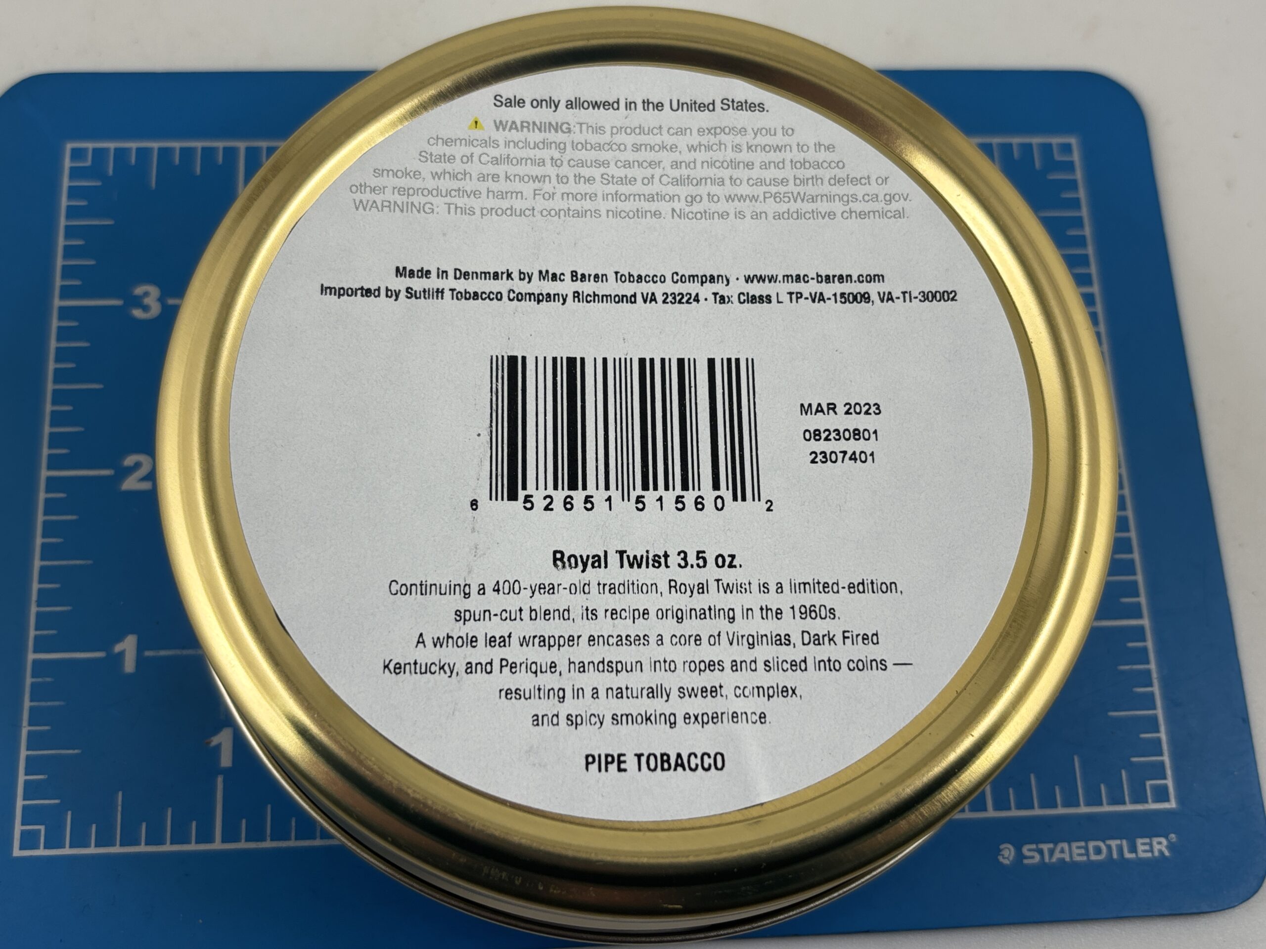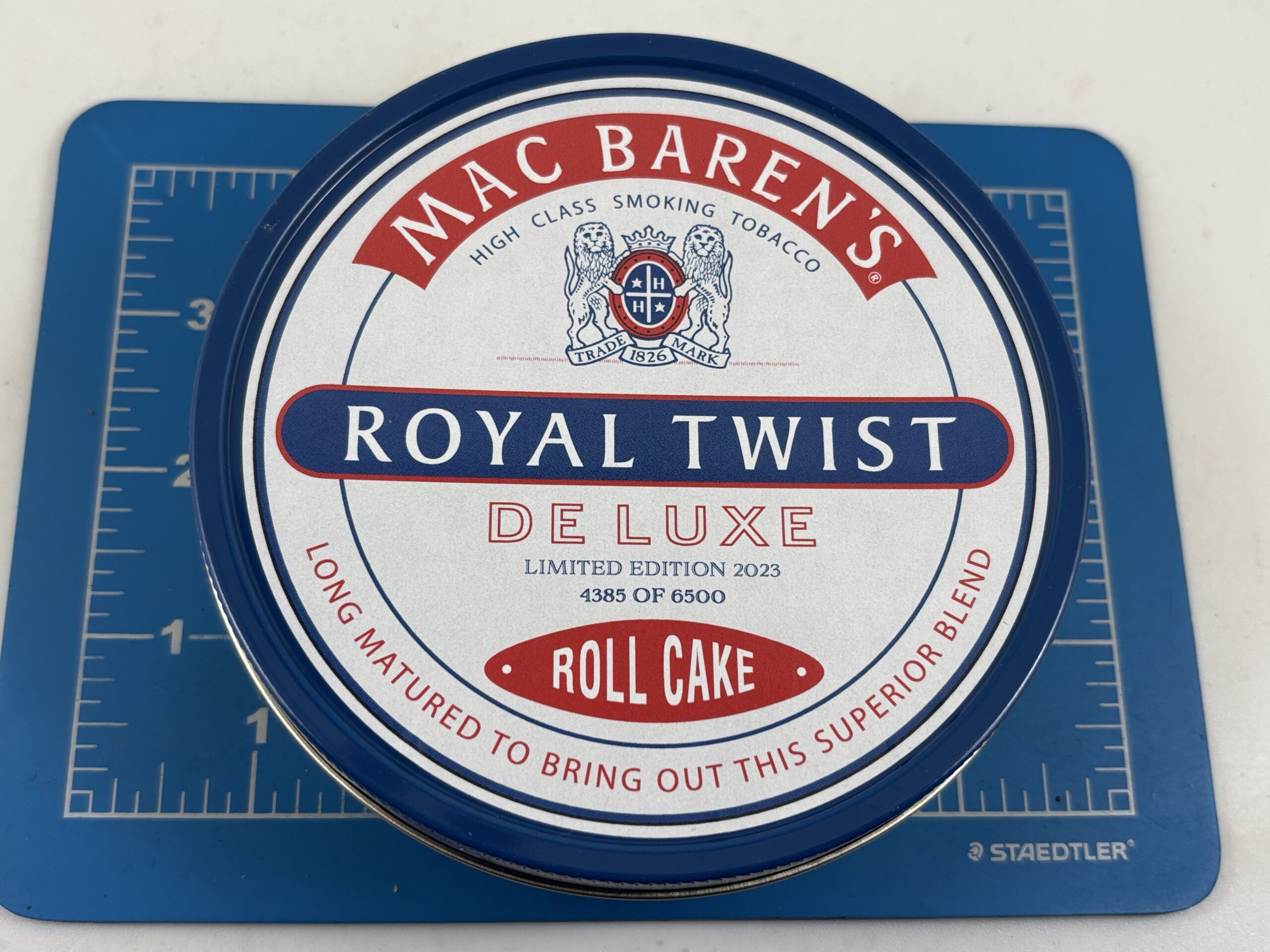 Excellent Sealed 2023 Mac Baren's Royal Twist De Luxe #4385 of 6500 Roll Cake 3.5oz. Tin.