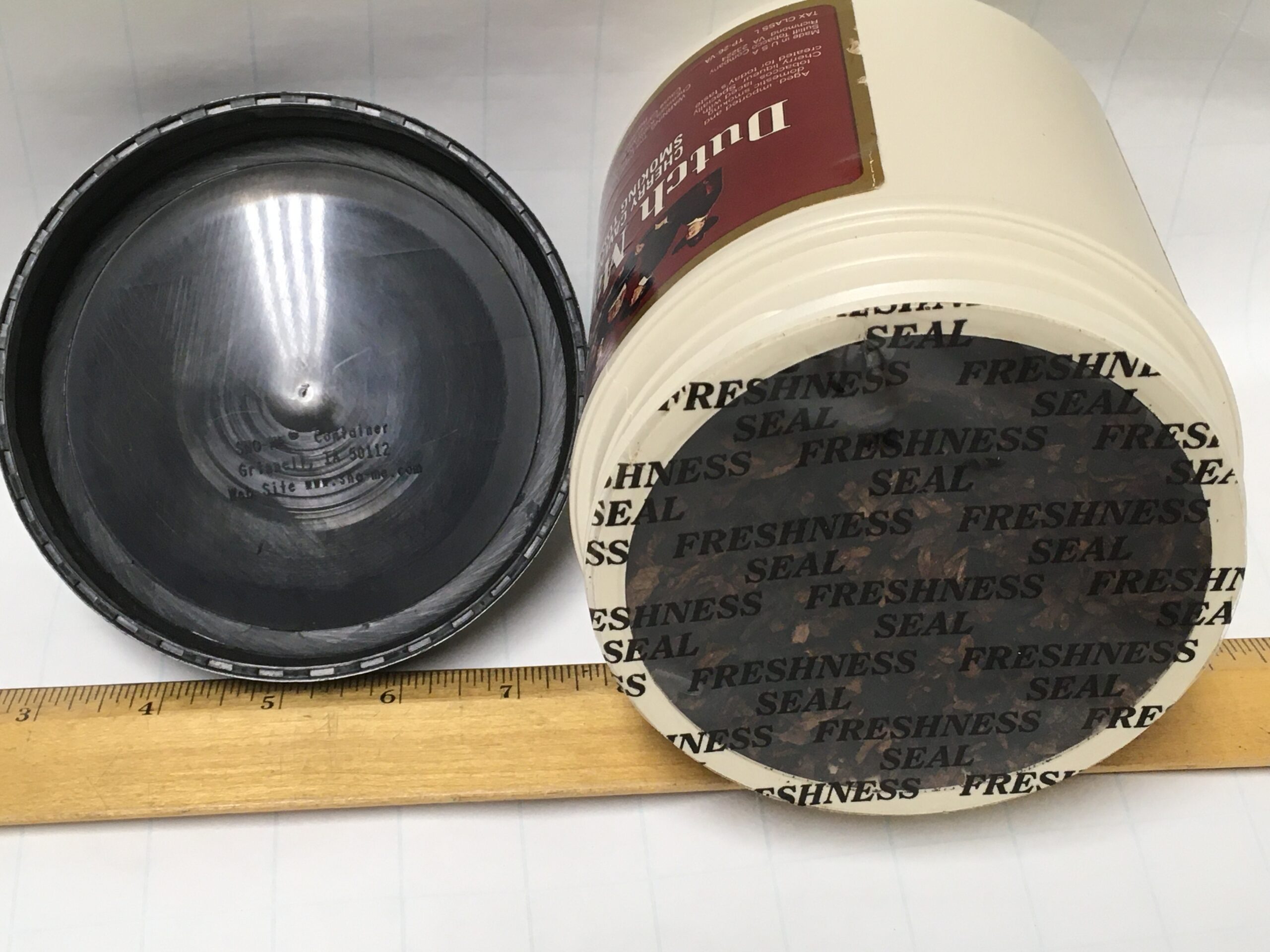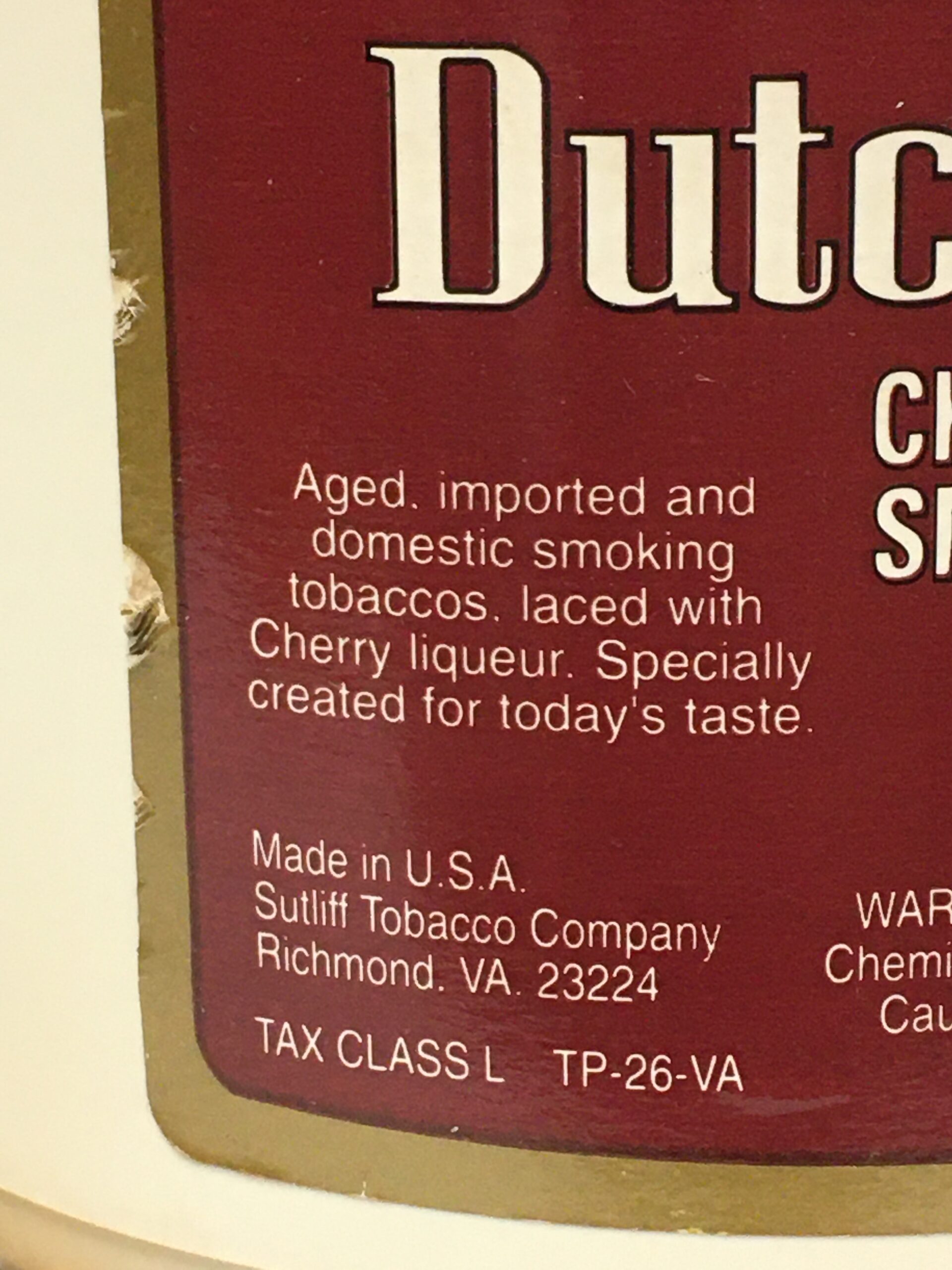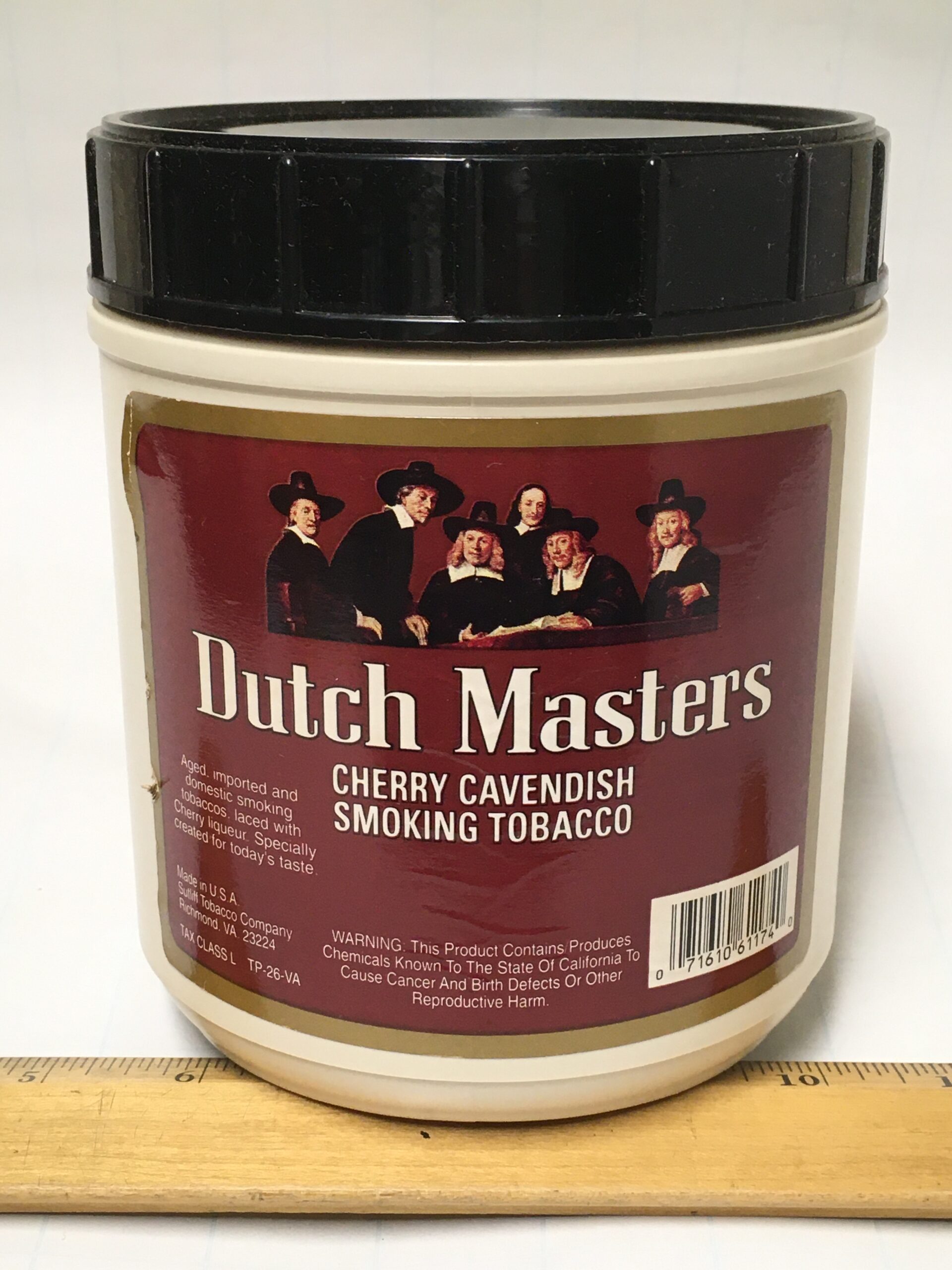 Aged in the factory sealed plastic can: DUTCH MASTERS CHERRY CAVENDISH SMOKING TOBACCO, by SUTLIFF (1980s?) - 12 oz.