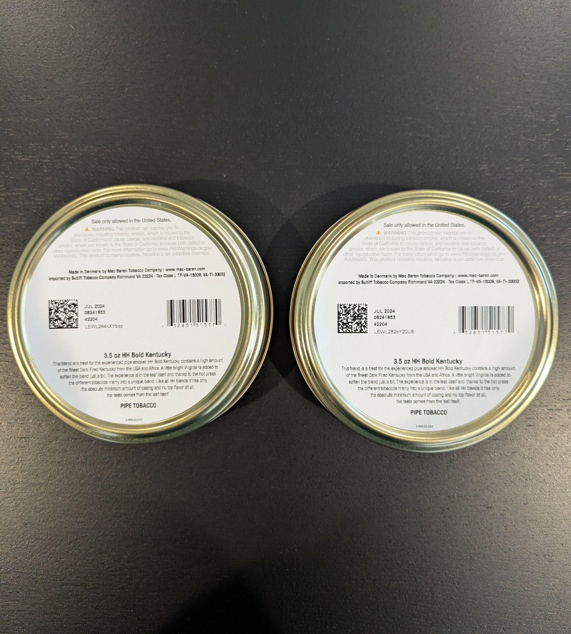 two sealed 3.5 oz tins of 2024 Mac Baren HH Bold Kentucky