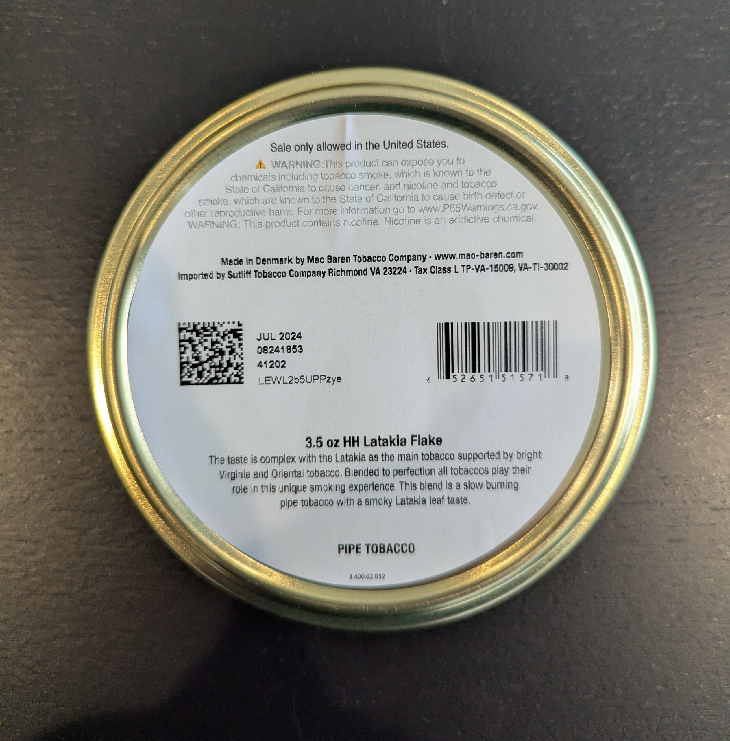 1 sealed 3.5 oz tin of 2023 Mac Baren HH Latakia Flake