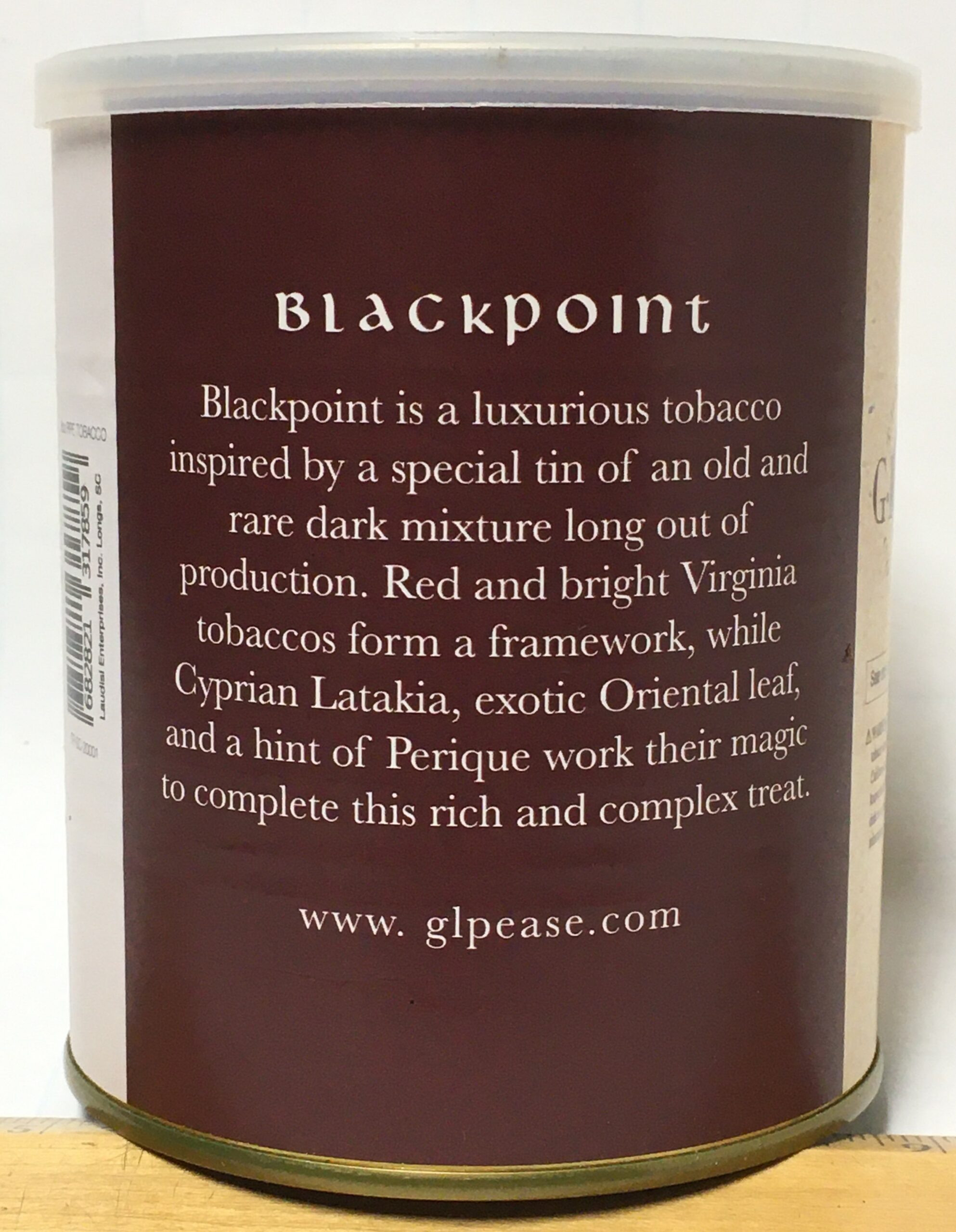 "Blackpoint is a luxurious blend of Red and Lemon Virginias, Cyprian Latakia, exotic Oriental tobaccos, and a perfect measure of Louisiana Perique for a lively, piquant finish from G. L. Pease. The smoke is creamy and lingering, engaging the palate with a mouth-filling array of wonderful flavors. Reminiscent of raisins and stewed figs, fireplaces in the fall and walks in the forest. Perhaps the most complex in the collection. Perfect for an evening stroll or good book."