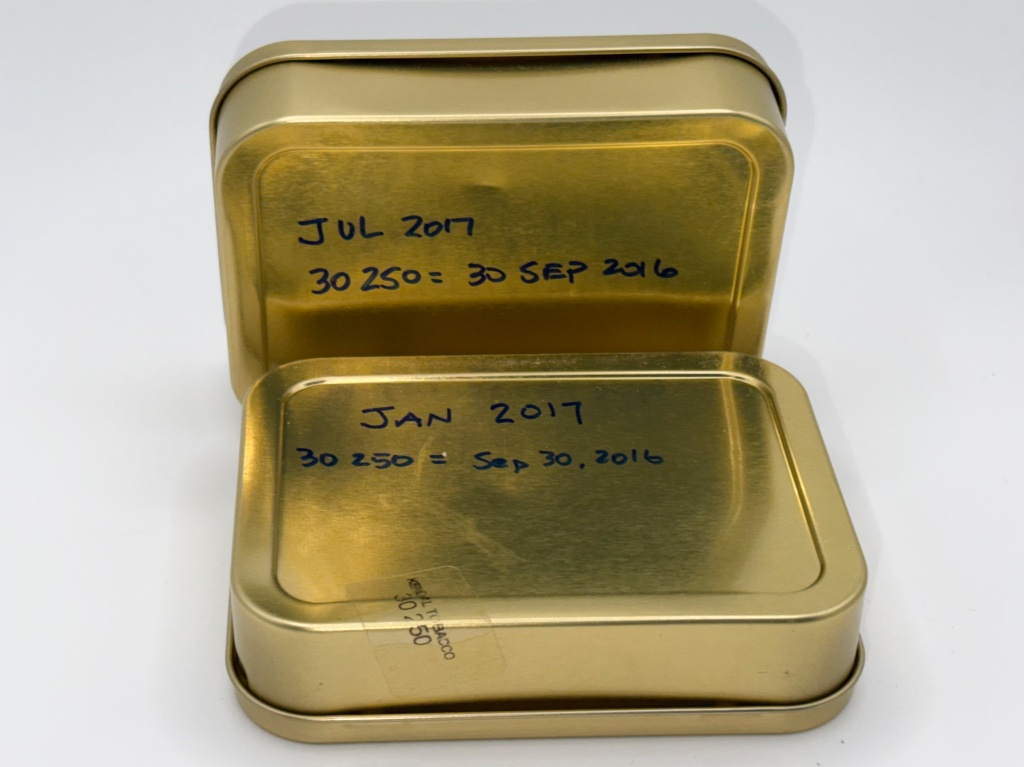 Two unopened 50g tins of Samuel Gawith Balkan Flake from my private collection. The tin dates of "30 250" equate to Sep 30, 2016 - were purchased new by me in 2017 and cellared in the dark at a near constant 68 degrees ever since.