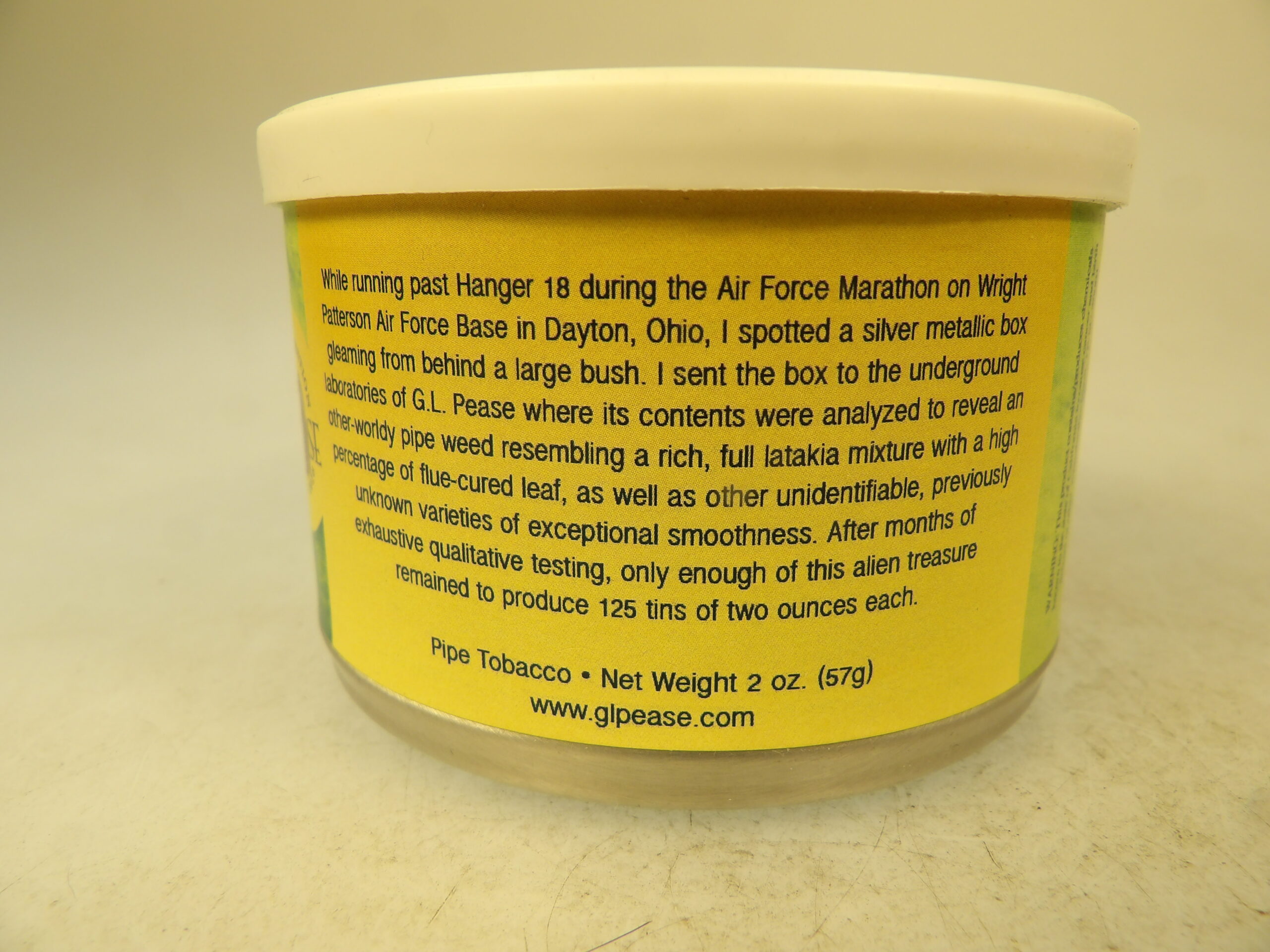 DESCRIPTION: Here is an auction for sale. It is a Vintage Collectible 10 Years Old G.L. Pease NASPC Invasion 2 oz’s Pipe Tobacco Tin Annual 2016 Show. This tin is sealed and has never been opened. While running past Hanger 18 during the Air Force Marathon on Wright Patterson Air Force Base in Dayton, Ohio, I spotted a silver metallic box gleaming from behind a large bush. I sent the box to the underground laboratories of G.L. Pease where its contents were analyzed to reveal an other-worldly pipe weed resembling a rich, full latakia mixture with a high percentage of flue-cured leaf, as well as other unidentifiable, previously unknown varieties of exceptional smoothness. After months of exhaustive qualitative testing, only enough of this alien treasure remained to produce 125 tins of two ounces each. Good Luck Bidding and Thanks for Stopping by.