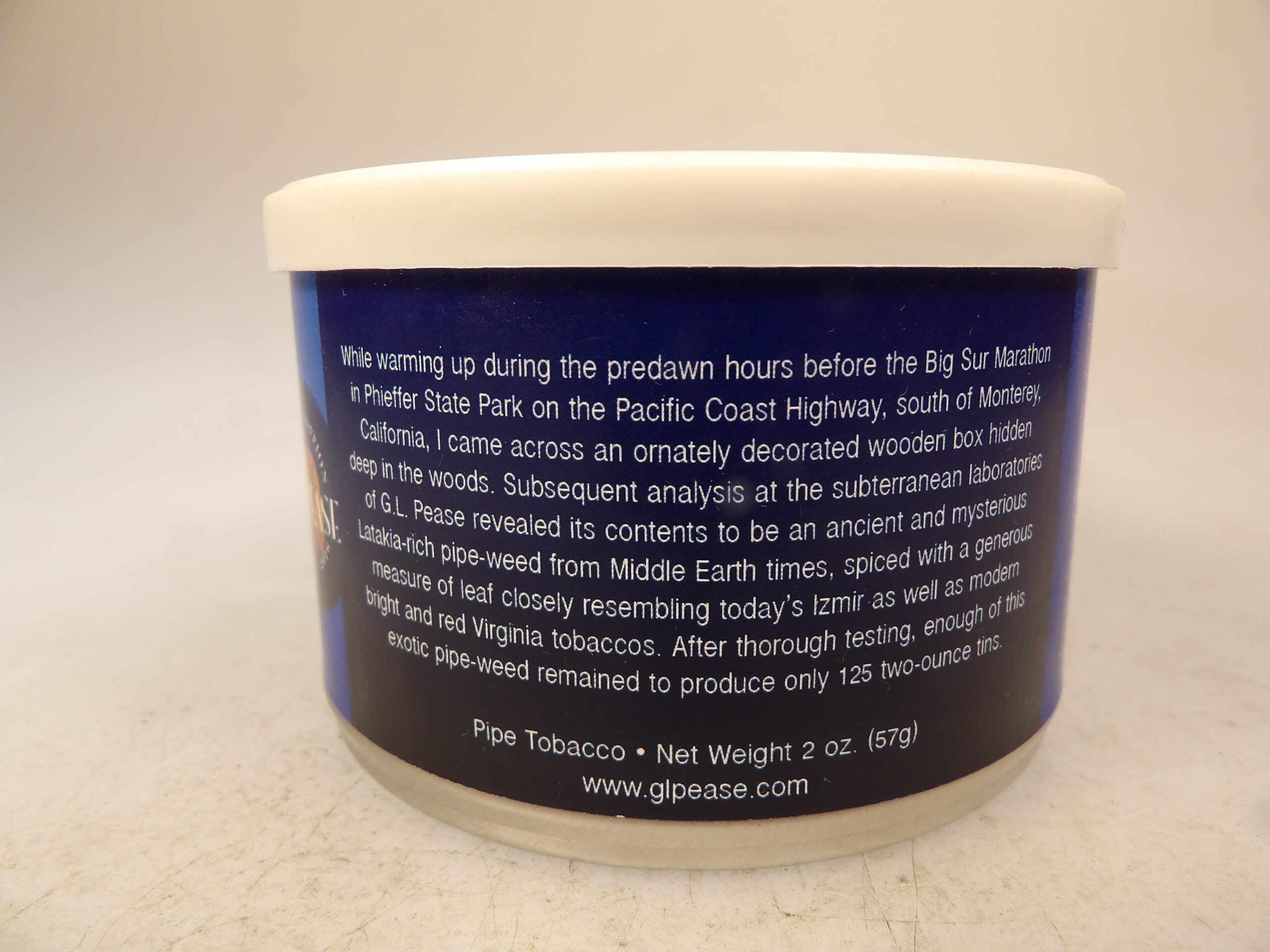 DESCRIPTION: Here is an auction for sale. It is a Vintage Collectible 16 Years Old G.L. Pease NASPC Night Wrath Blend 2 oz’s Sealed Pipe Tobacco Tin Annual 2016 Show. This tin is sealed and has never been opened. This tin is a limited blend tin produced for this year only during the NASPC 2016 annual show. While warming up during the predawn hours before the Big Sur Marathon in Pheiffer State Park on the Pacific Coast Highway, south of Monterey, California, I came across an ornately decorated wooden box hidden deep in the woods. Subsequent analysis at the subterranean laboratories of G.L. Pease revealed its contents to be an ancient and mysterious latakia rich pipe weed from Middle Earth times, spiced with a generous measure of leaf closely resembling today's Izmir as well as modern bright and red Virginia tobaccos. After thorough testing, enough of this exotic pipe weed remained to produce only 125 two-ounce tins. Notes: 2016 NASPC Show Limited Edition. Good Luck Bidding and Thanks for Stopping by.