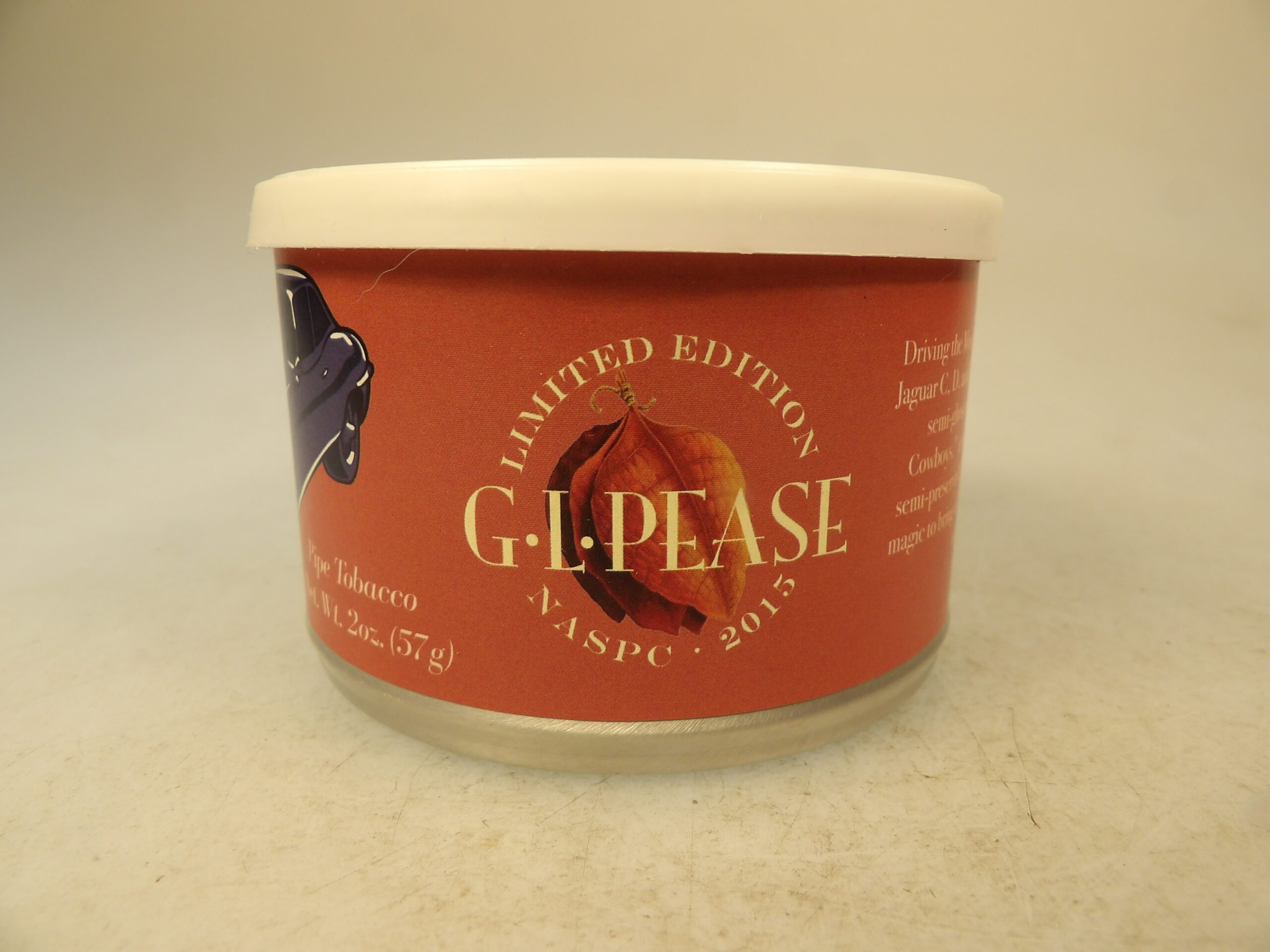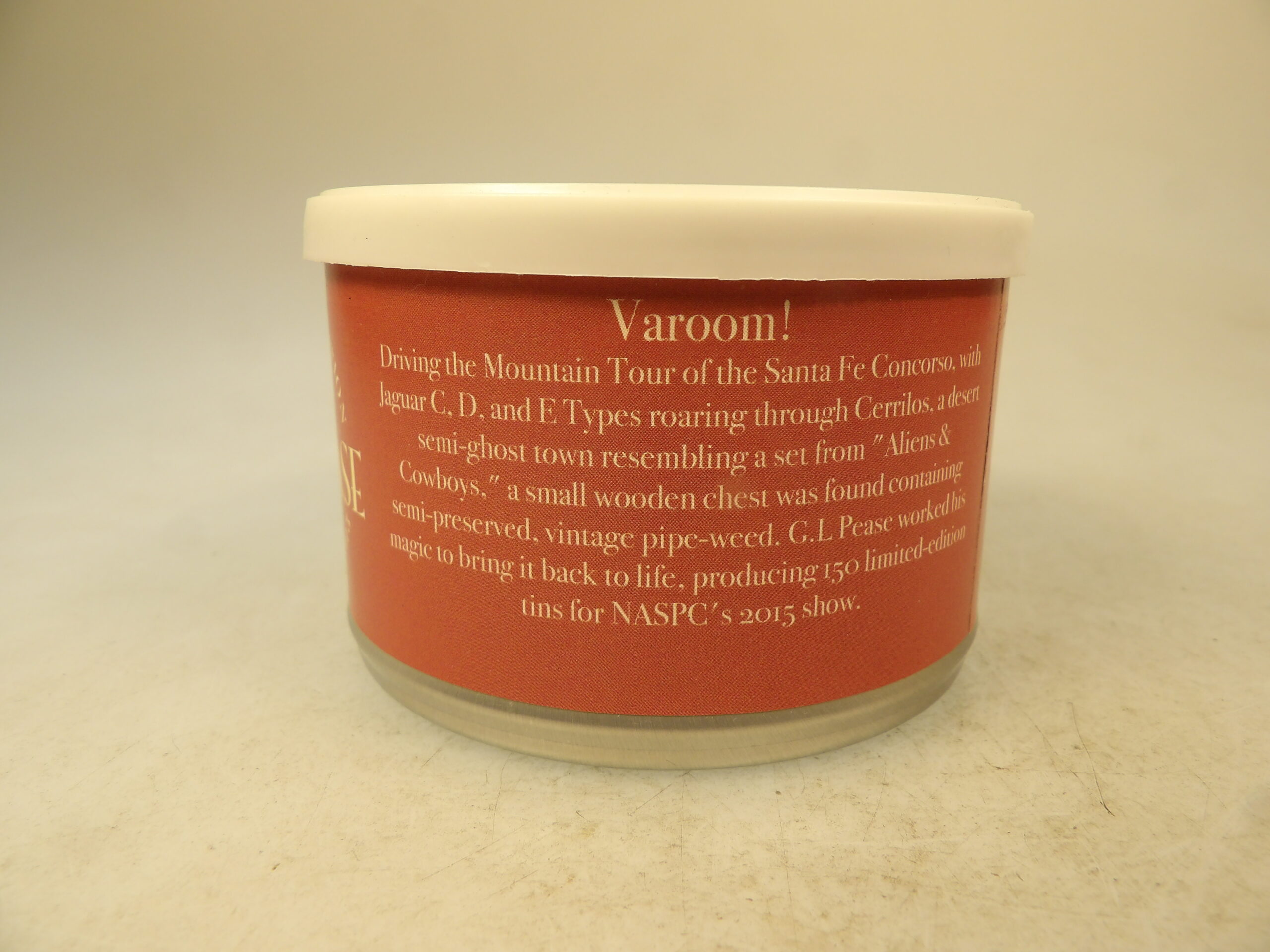 DESCRIPTION: Here is an auction for sale. It is a Vintage Collectible NASPC Show Varoom 2015 Tobacco a G.L. Pease 2 Oz. Sealed Pipe Tobacco Tin. This tin is sealed and has never been opened. Driving the mountain tour of the Santa Fe Concorso, with Jaguar C.D. and E Types roaring through Cerrilos, a desert semi-ghost town resembling a set from "Aliens & Cowboys," a small wooden chest was found containing semi-preserved vintage pipe weed. G.L. Pease worked his magic to bring it back to life, producing 150 limited-edition tins for the NASPC's 2015 show. Virginias, some Burley, some possible Oriental and a smattering of Black Cavendish and Latakia. Good Luck Bidding and Thanks for Stopping by.
