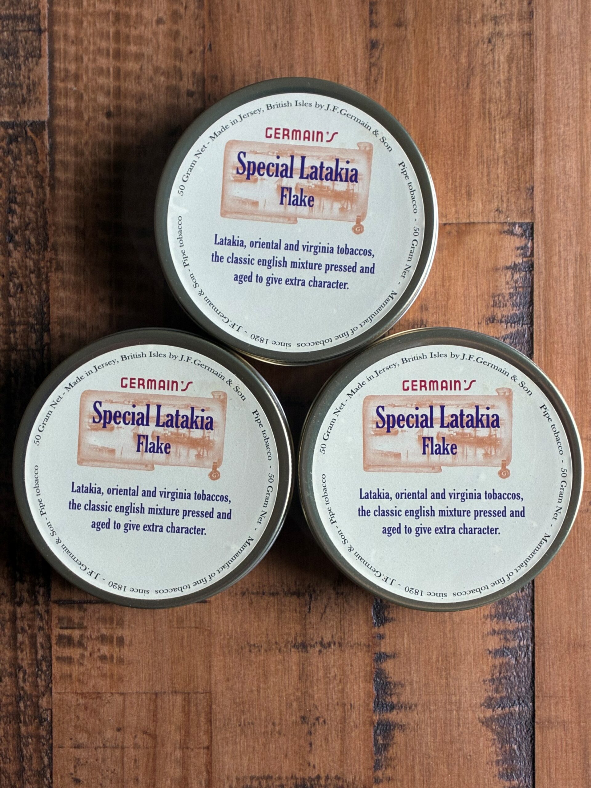 Three sealed, unopened tins of Germain's Special Latakia Flake. Always stored in a temperature controlled tobacco cellar. Recent production, 2025