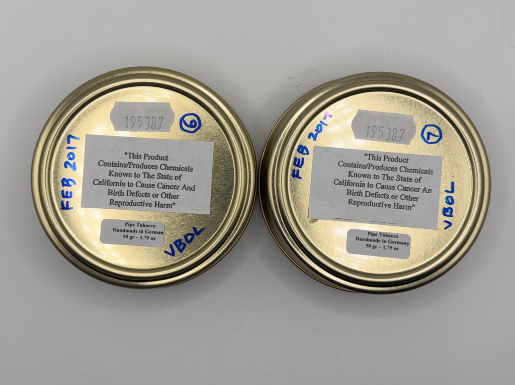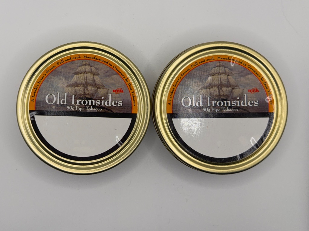 Two unopened 50g tins of Dan Tobacco Old Ironsides from my private collection. Were purchased new by me in 2017 and cellared in the dark at a near constant 68 degrees ever since.