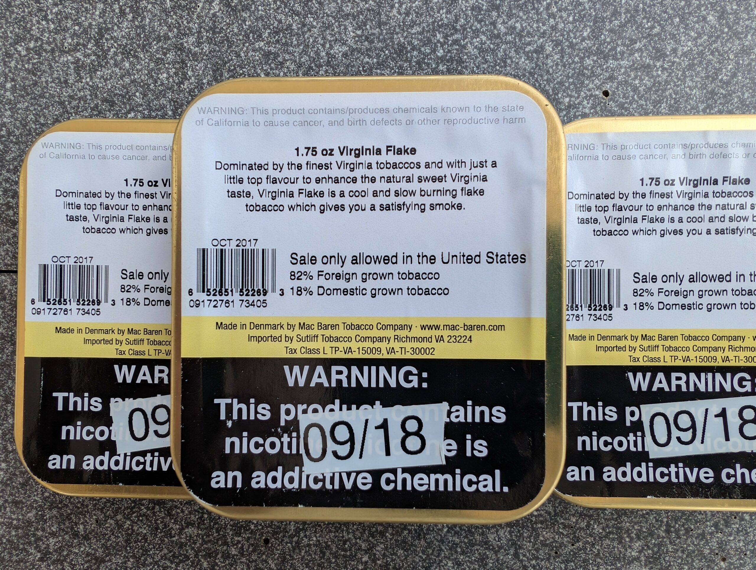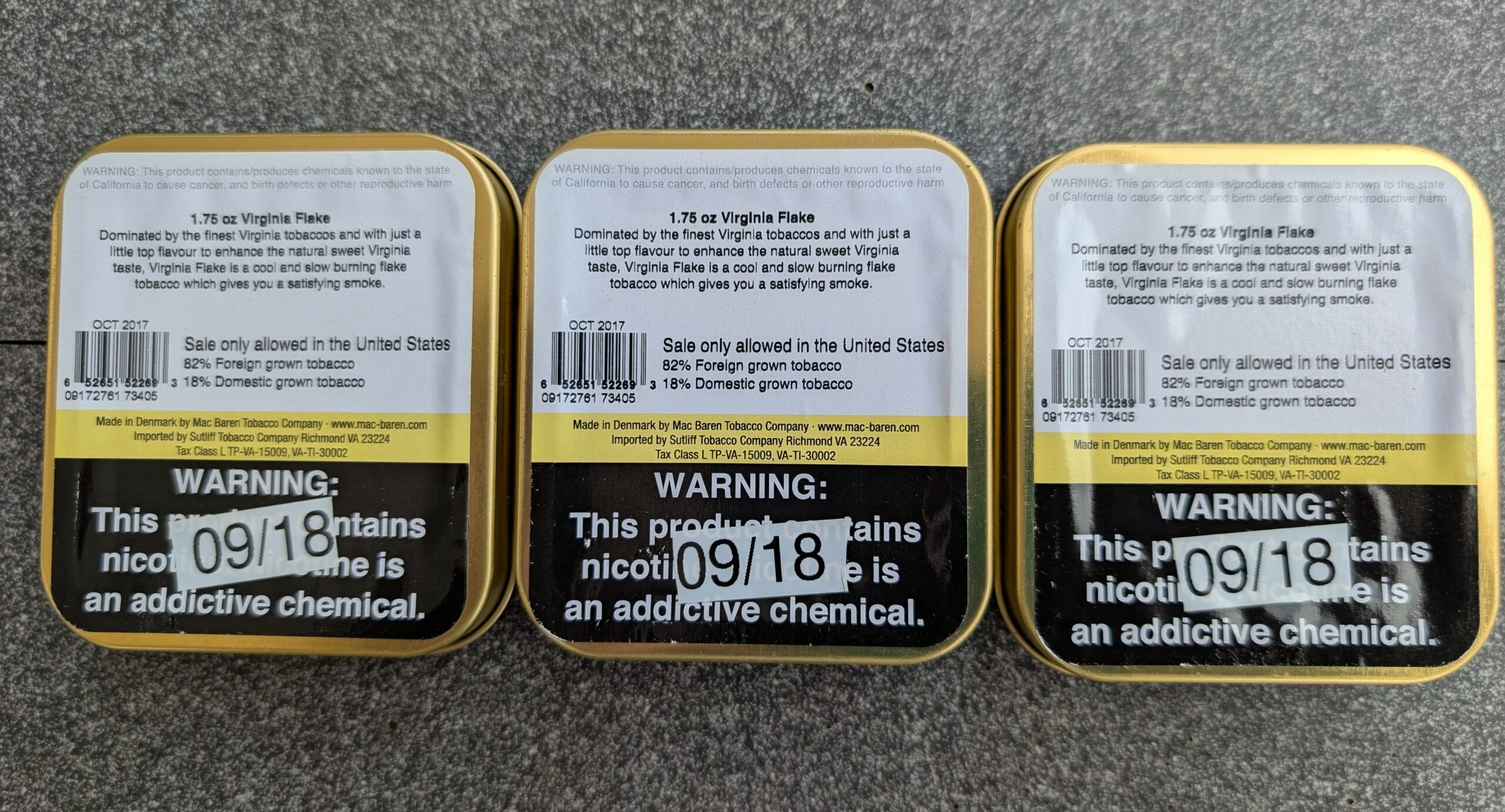 Manufactured in 2017 and purchased in 2018. Stored in a dark and temperate location. Includes 3 tins at 1.75oz each. Date of manufacture can be seen near the barcode on the back label