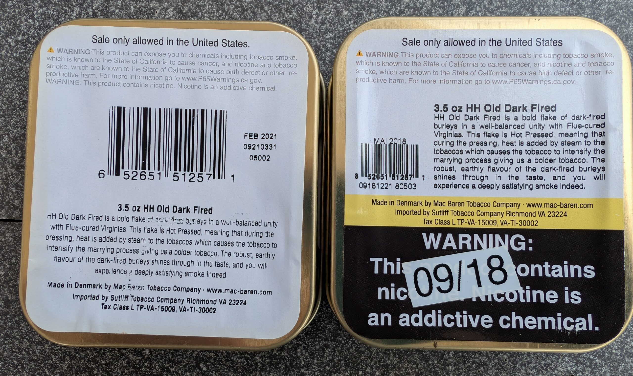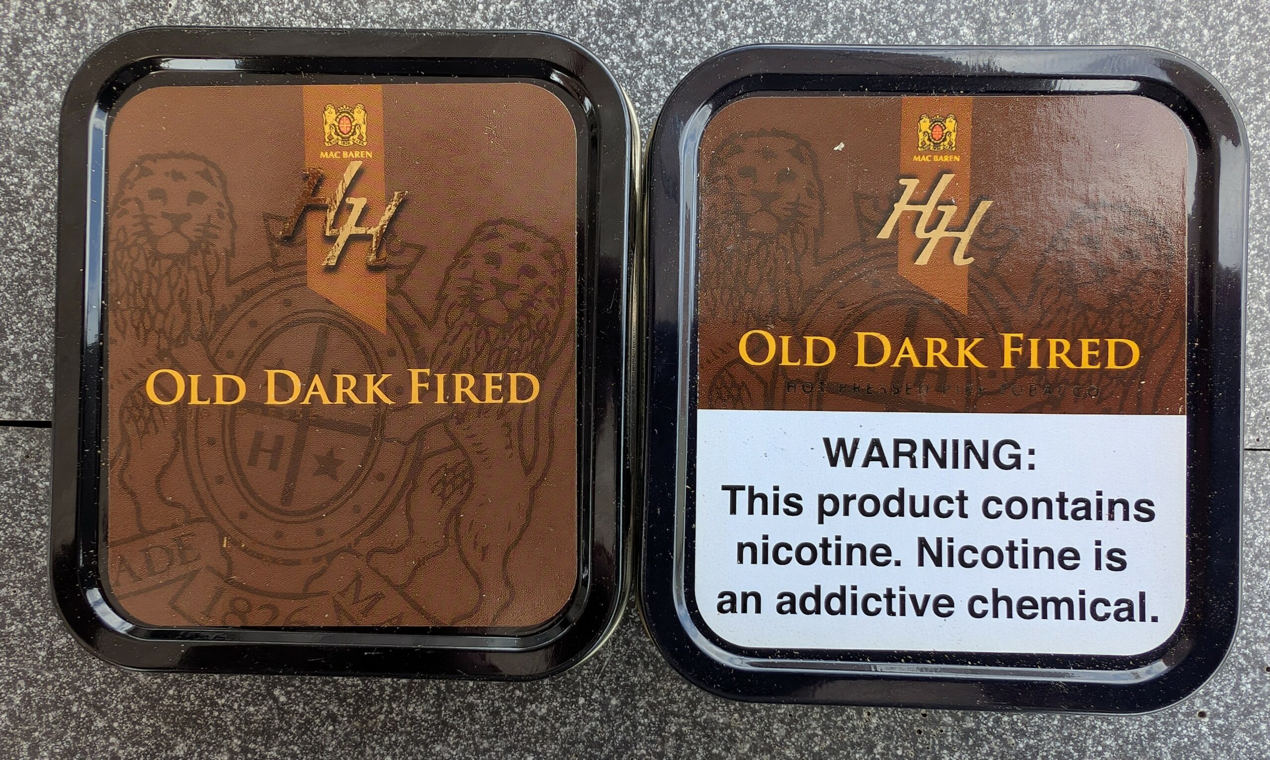 2 3.5oz Tins of MacBaren HH Old Dark Fired, one manufactured in 2018 and one in 2021. Stored in a dark and temperate location since purchased.