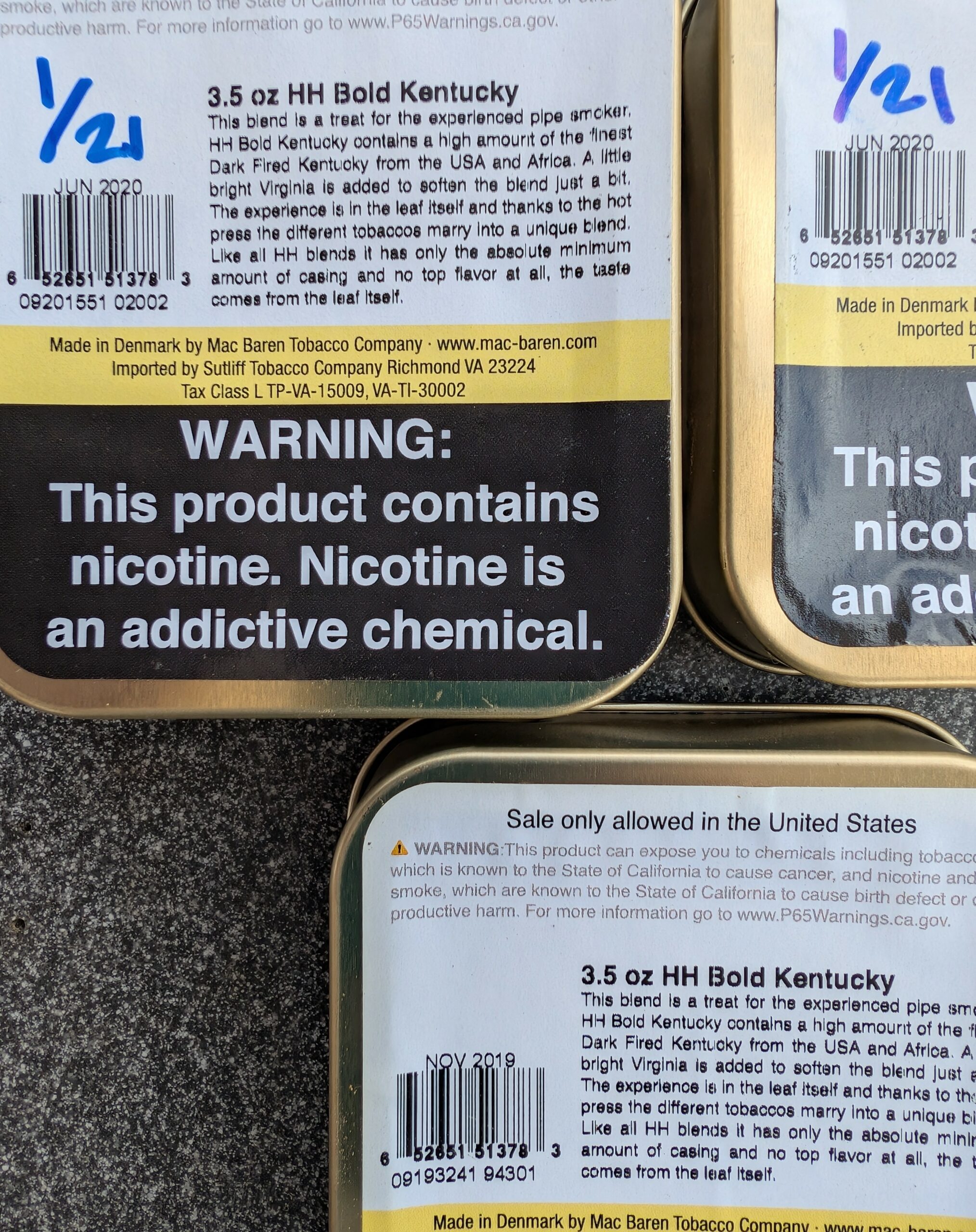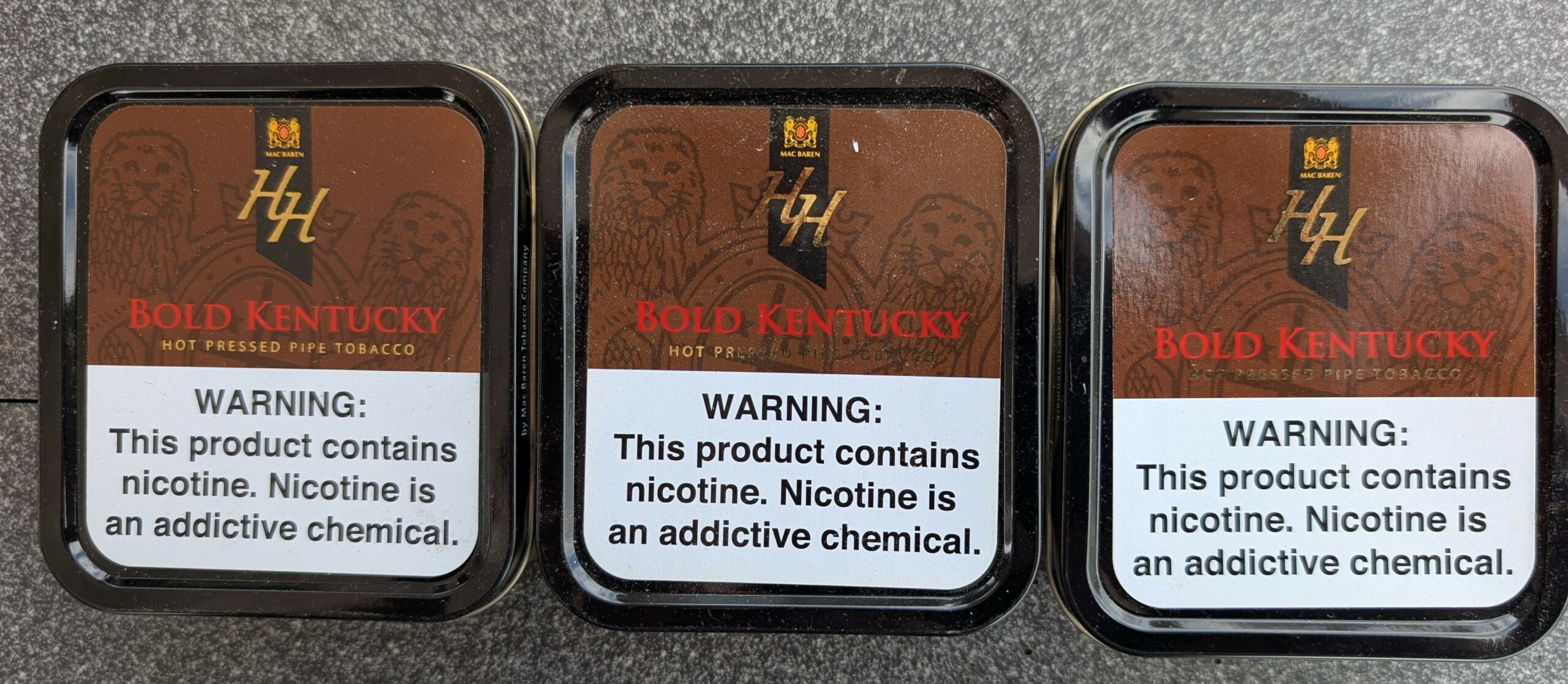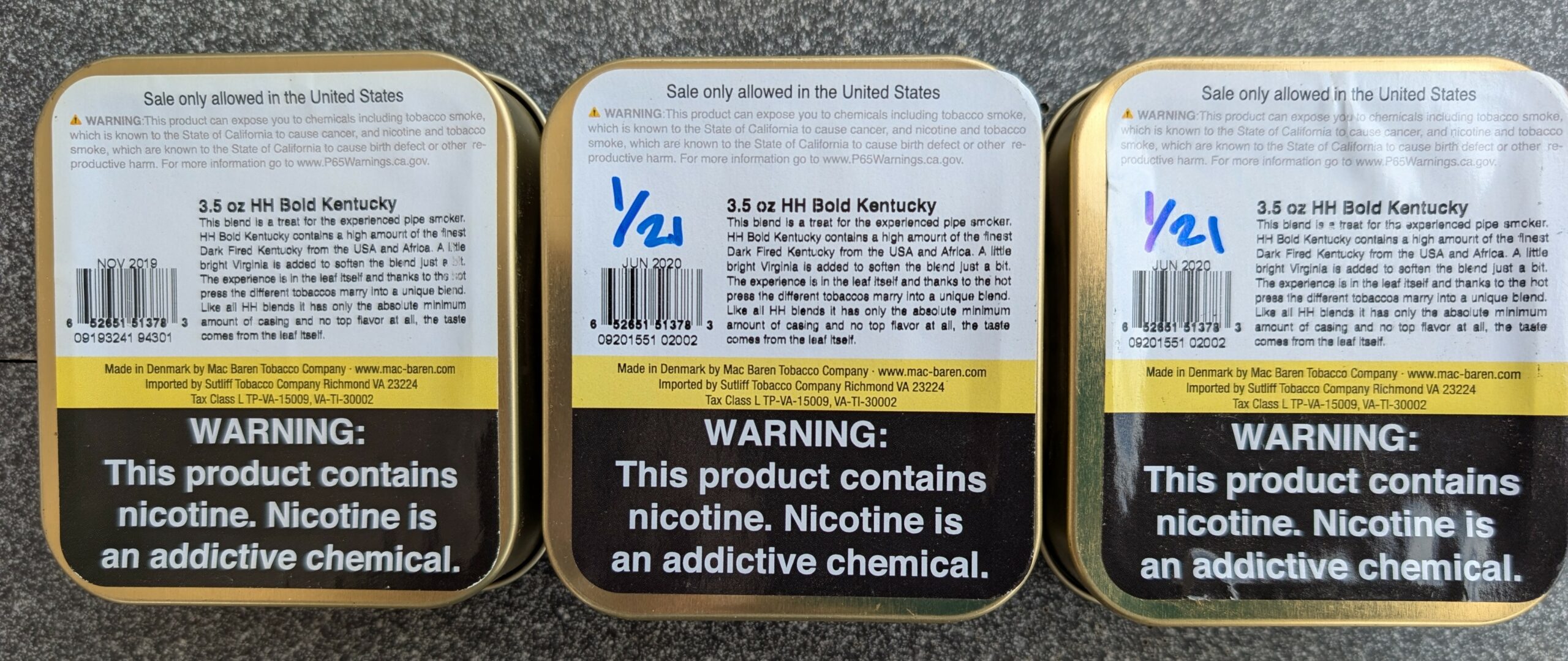 3 3.5oz tins of MacBaren HH Bold Kentucky, 1 manufactured 2019 and 2 manufactured 2020. Stored in a dark and temperate location since purchased.
