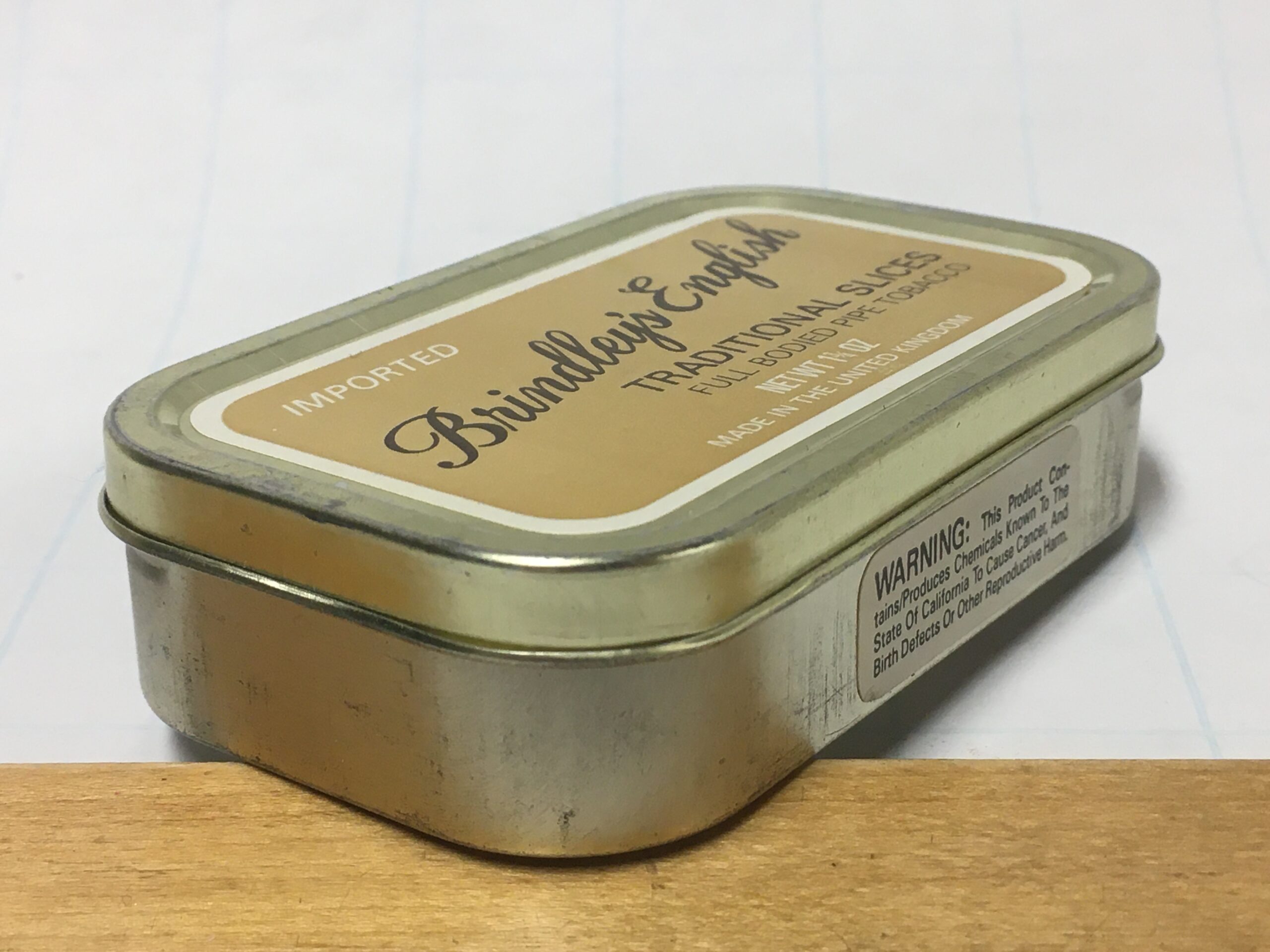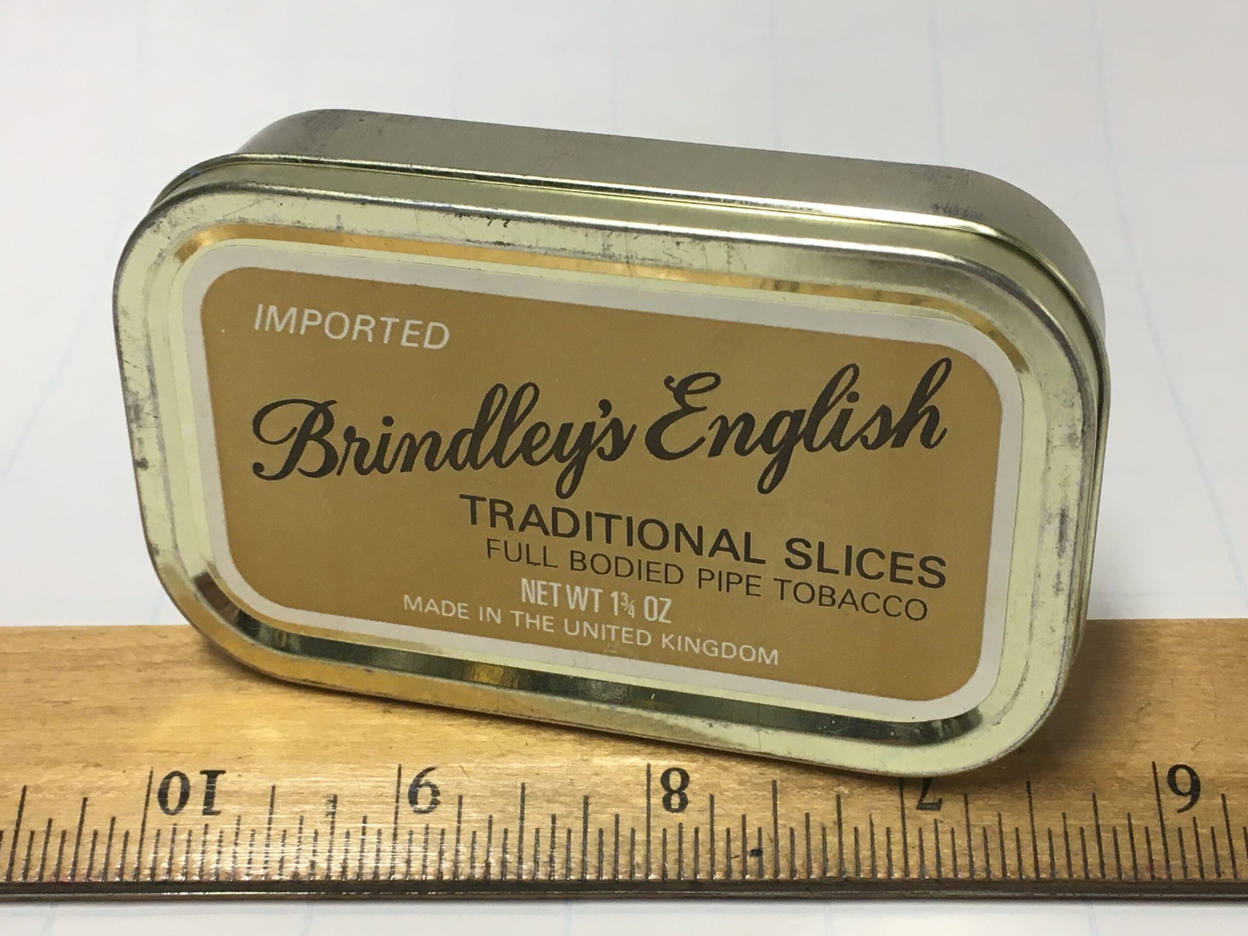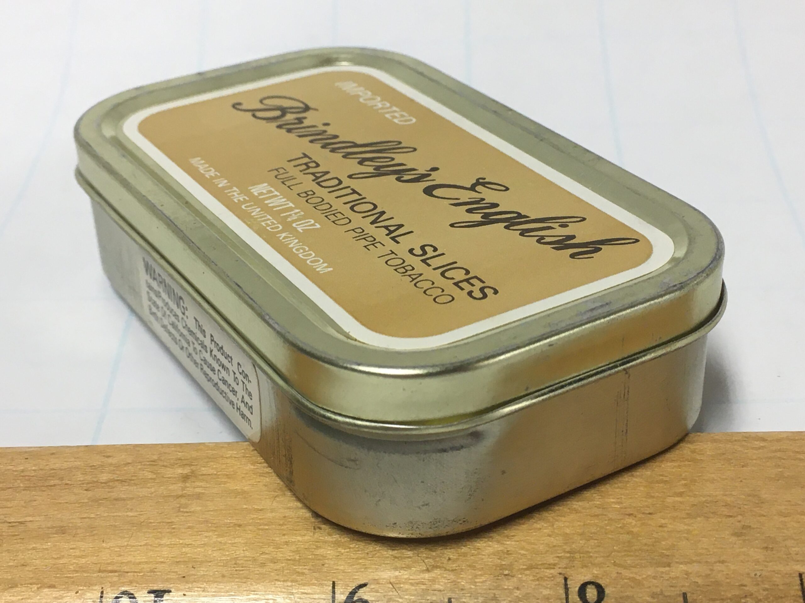 "IMPORTED Brindley's English - TRADITIONAL SLICES - FULL BODIED PIPE TOBACCO", in 1-1/4 OZ. sealed tin.