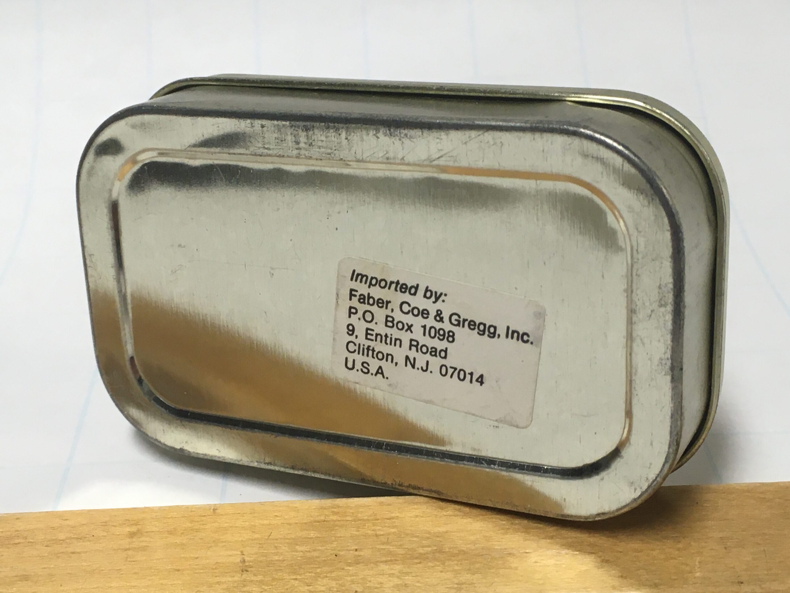 Tin was very well kept, and is in excellent aged condition. Zero cracks, stress points, etc. Top decal looks virtually perfect, gold-tone lid shows some stock wear on the contact points. Silver-tone base shows some stock wear around the perimeter. A few very small dings on the underside.