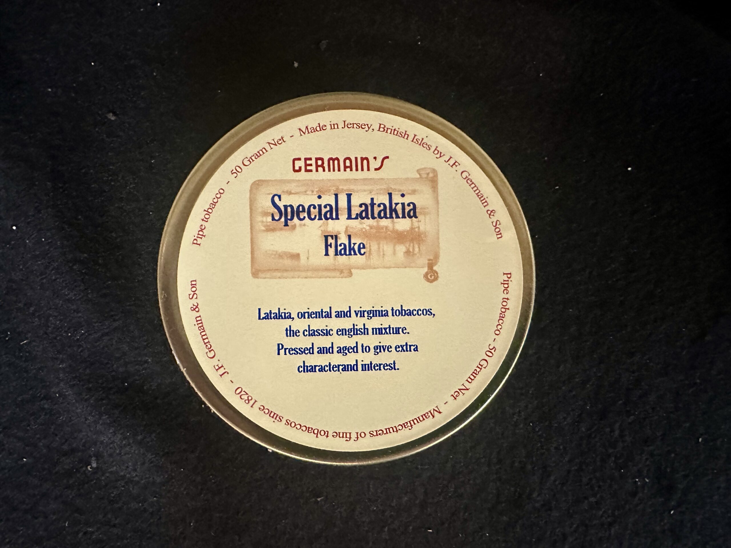 This auction is for one sealed tin of Germain’s Special Latakia Flake.