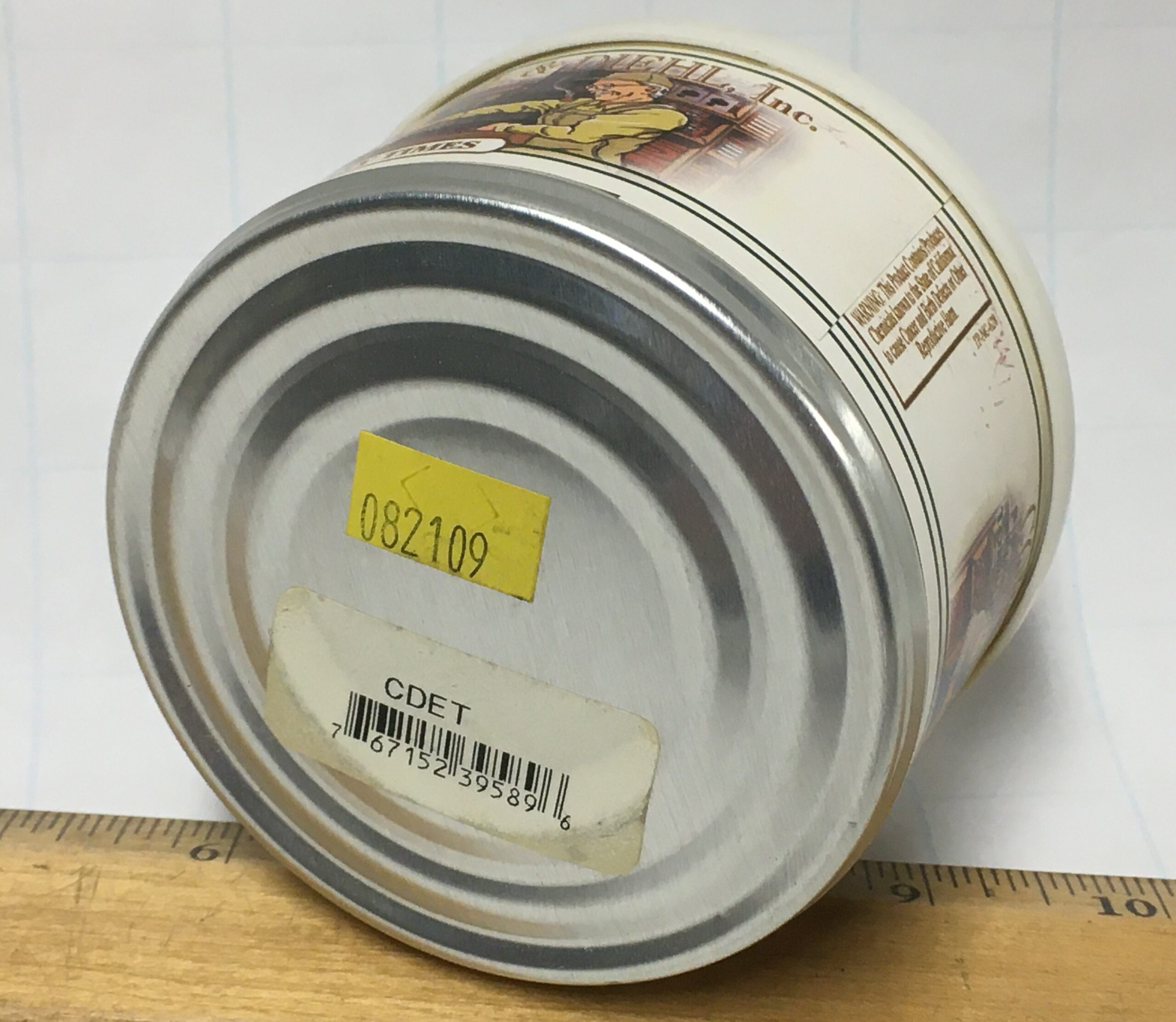 Tin was very well kept, with zero oxidation, rust, cracking, etc. Lid is still crisp and pliable, but discolored very slightly with age. Virtually perfect in every other way.