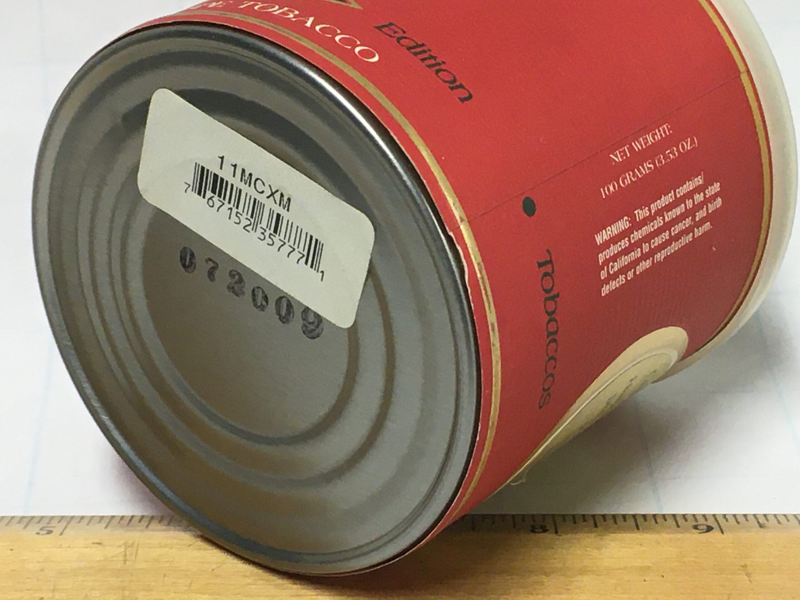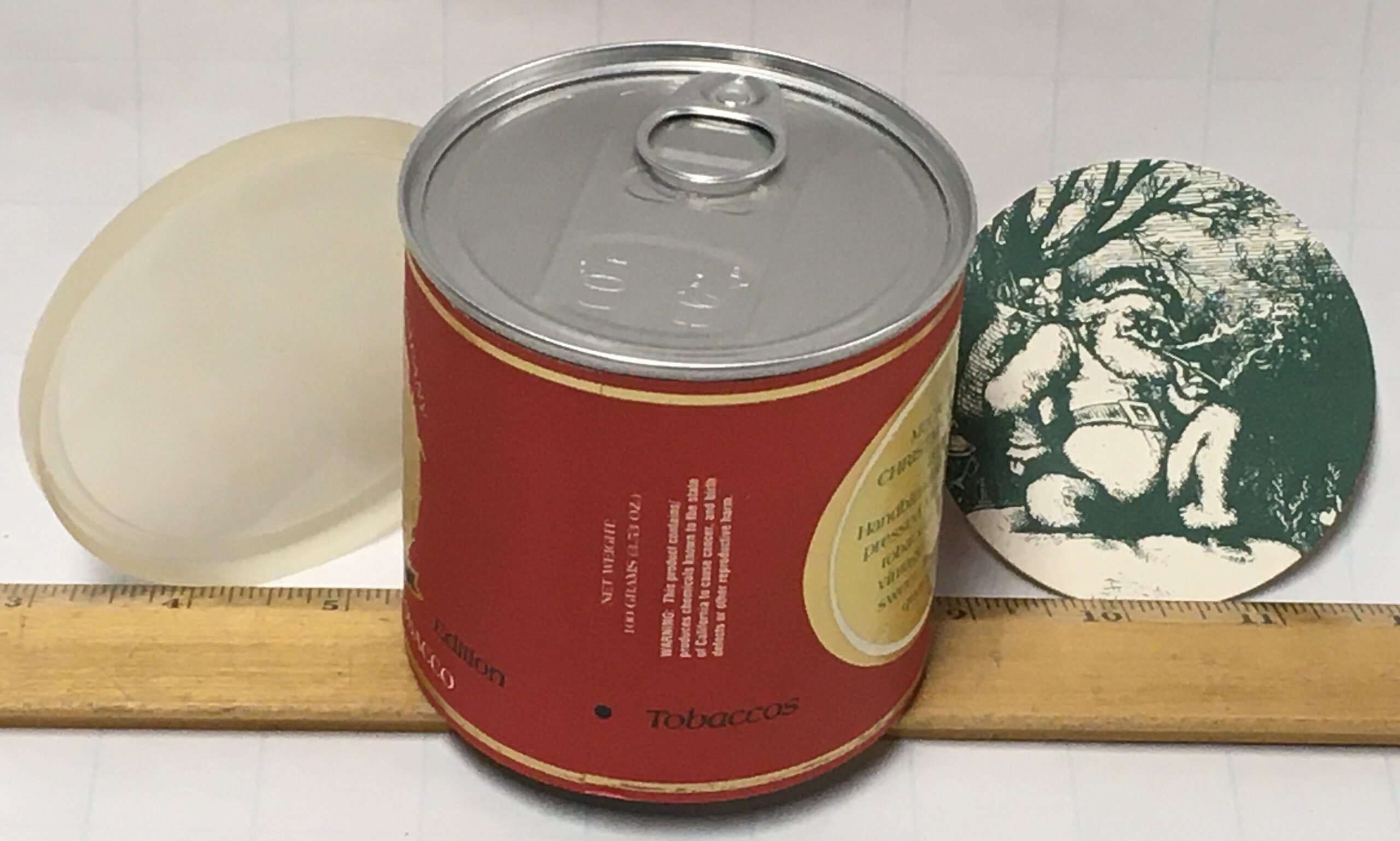 Tin was very well kept. Plastic lid still feels pliable, but has yellowed some with age. Virtually perfect in all other respects. No cracks, dents, dings, stress points, etc.