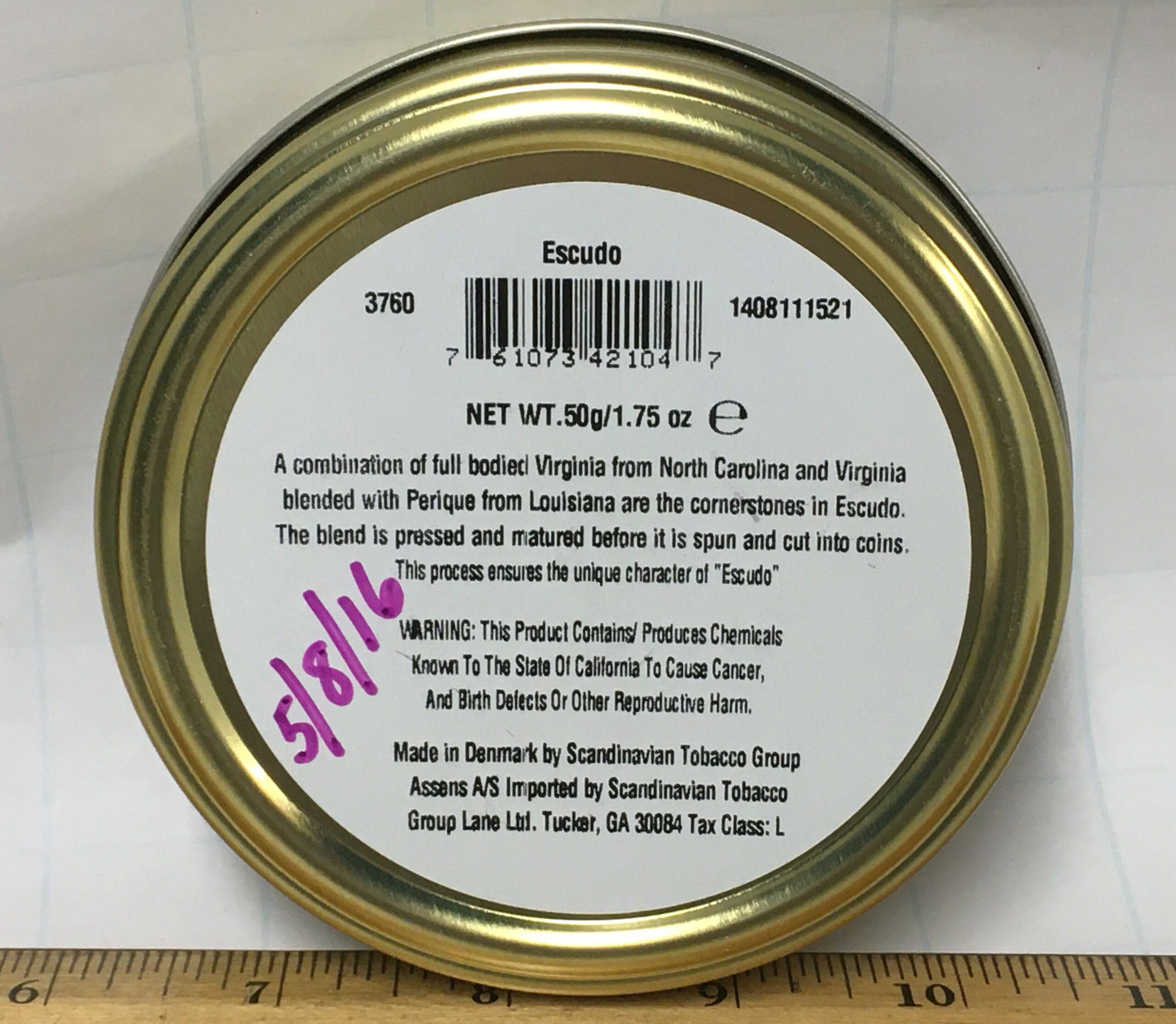 "A combination of full bodied Virginia from North Carolina and Virginia blended with Perique from Louisiana are the cornerstones in Escudo. The blend is pressed and matured before it is spun and cut into coins. This process ensures the unique character of 'ESCUDO'."