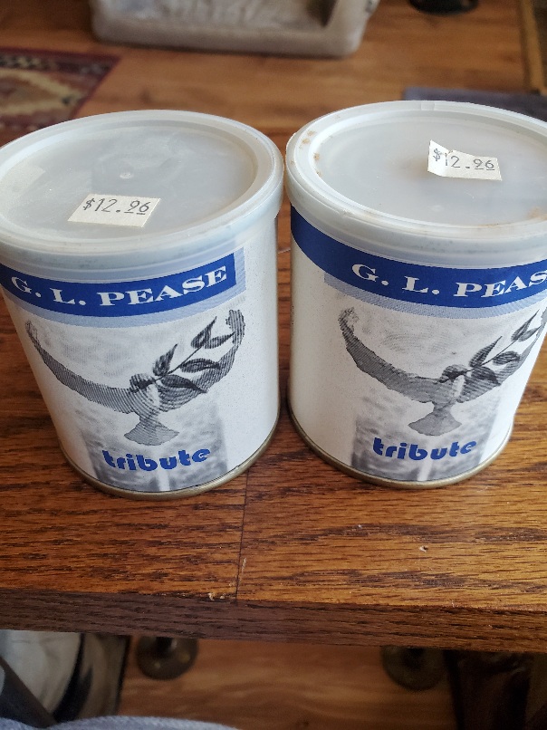 After the tragedy of 9/11/01, Greg Pease created a special blend as a tribute to the Americans lost to terrorism. These two limited edition cans are the last of my purchase from back then. The plastic cap of one can shows some rust colored blotches that do not wipe away. This coloration has not transferred to the can itself.