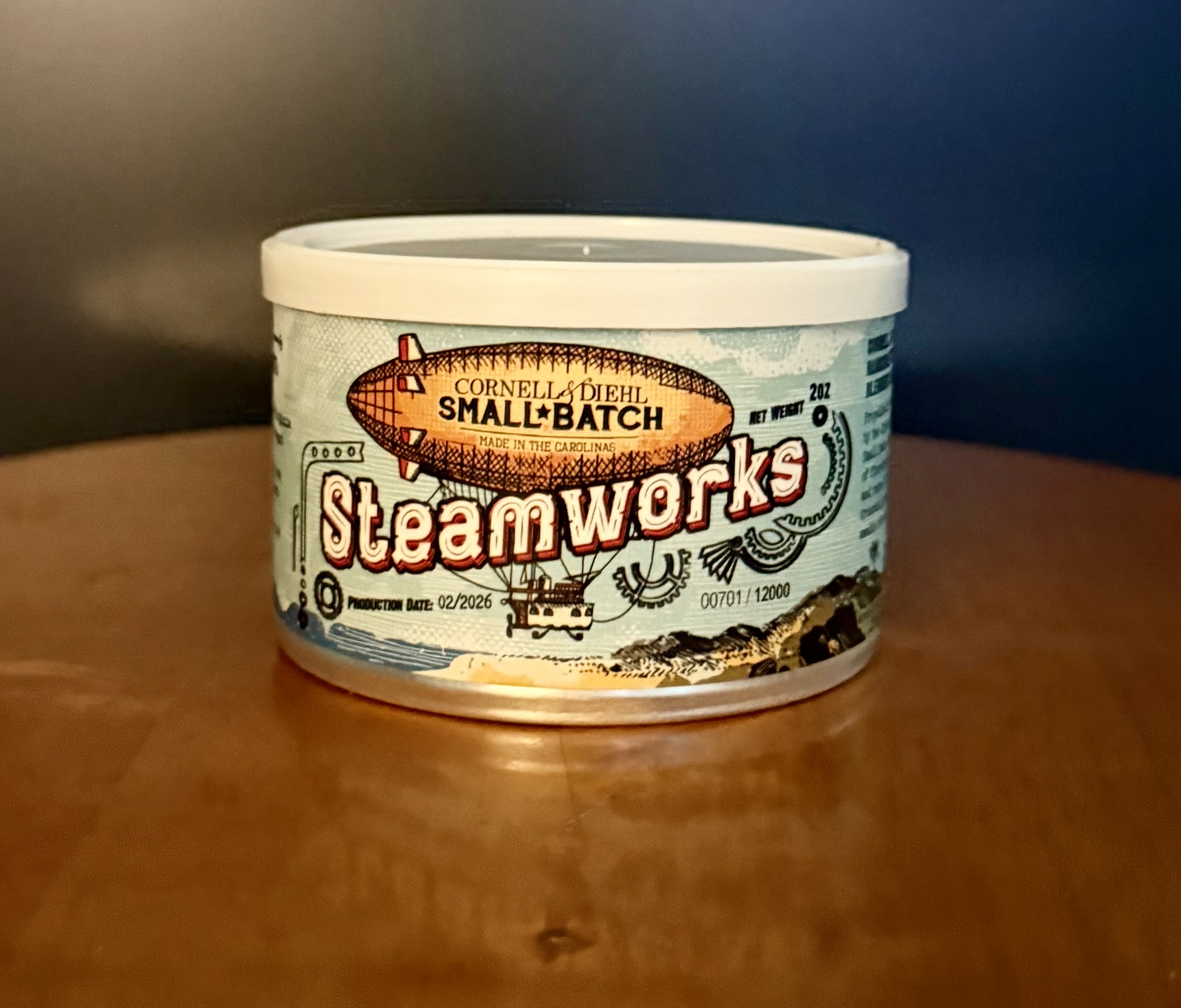 Cornell & Diehl's Small Batch: Steamworks is a complex Virginia/Oriental flake that explores the deep, natural sweetness of six exquisite flue-cured grades — ranging from deep Mahogany to brighter Lemon/Orange crops — enhanced by two distinct steaming processes. Presented in unsteamed, partially steamed, and blackened formats, these top-tier Virginia grades combine with a selection of vintage, heirloom Orientals, including Black Sea Sokhoum leaf from 2005, and genuine Louisiana Perique from C&D's exclusive farm in St. James Parish, to create a naturally sweet, subtly spicy, and exhilarating smoking mixture with a rich, matured flavor right out of the tin.